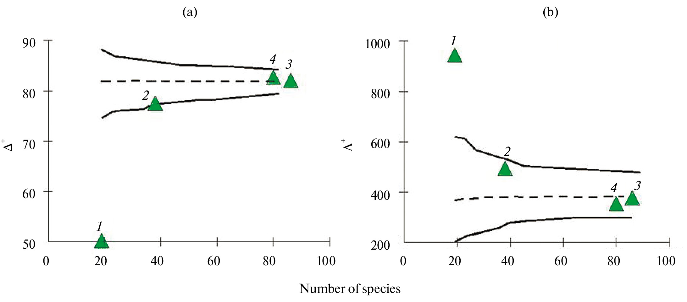 Variation in Taxonomic Distinctness index (VarTD, Λ+) shows the degree of horizontal evenness in the distribution of the number of lower taxa in the branches of high levels. It is calculated using the formula: Λ+ = [ΣΣi<j (ωij – ∆+)2]/[S(S – 1)/2] [3], with the same notations as in Eq. [2]. The more representatives from polyspecific branches in the community, the lower the indicators of hierarchical evenness of the taxonomic structure and the lower the values of the indices ∆+ and Λ+ (Clarke et al., 2014).