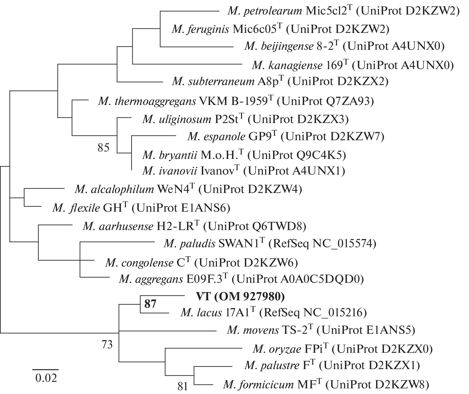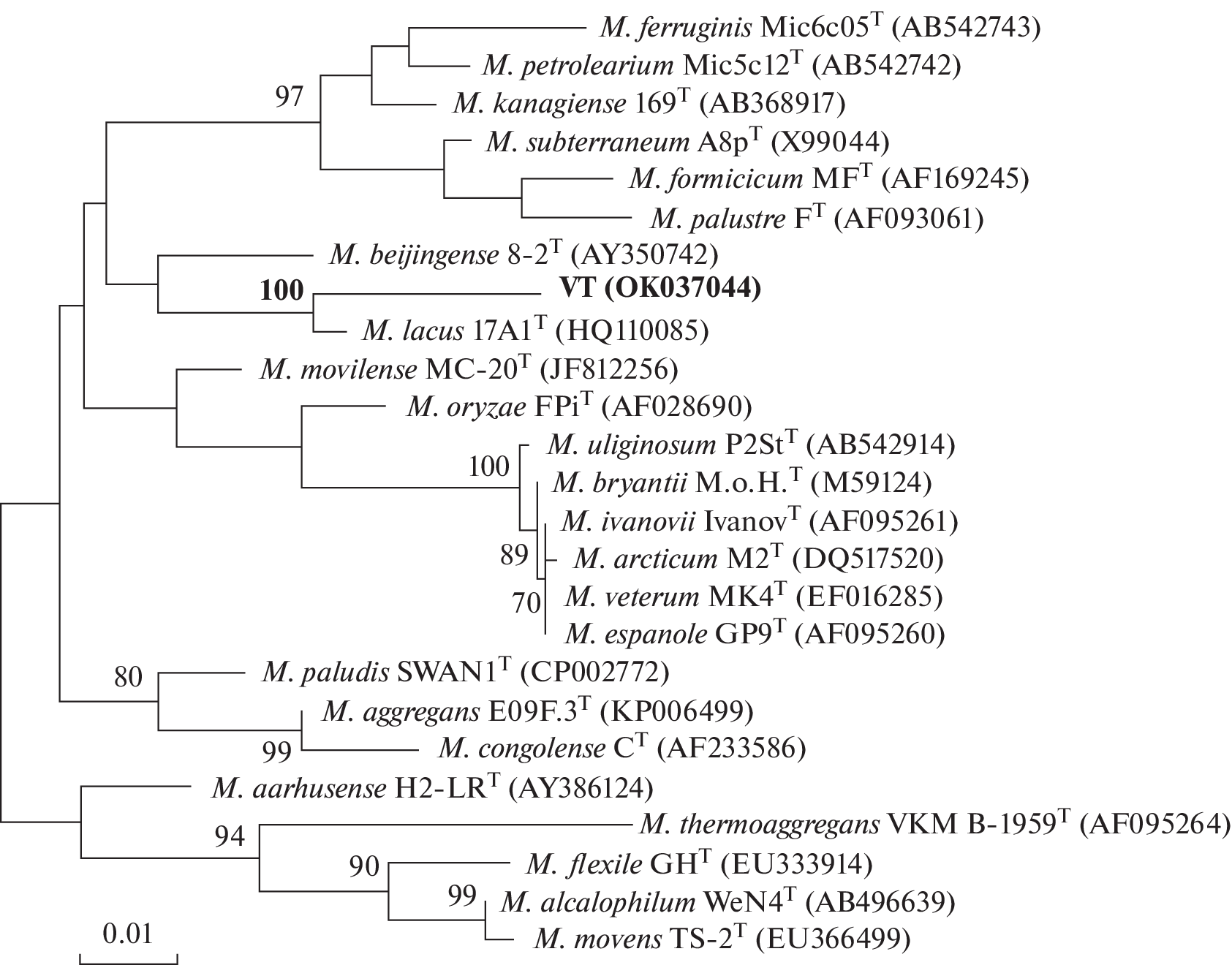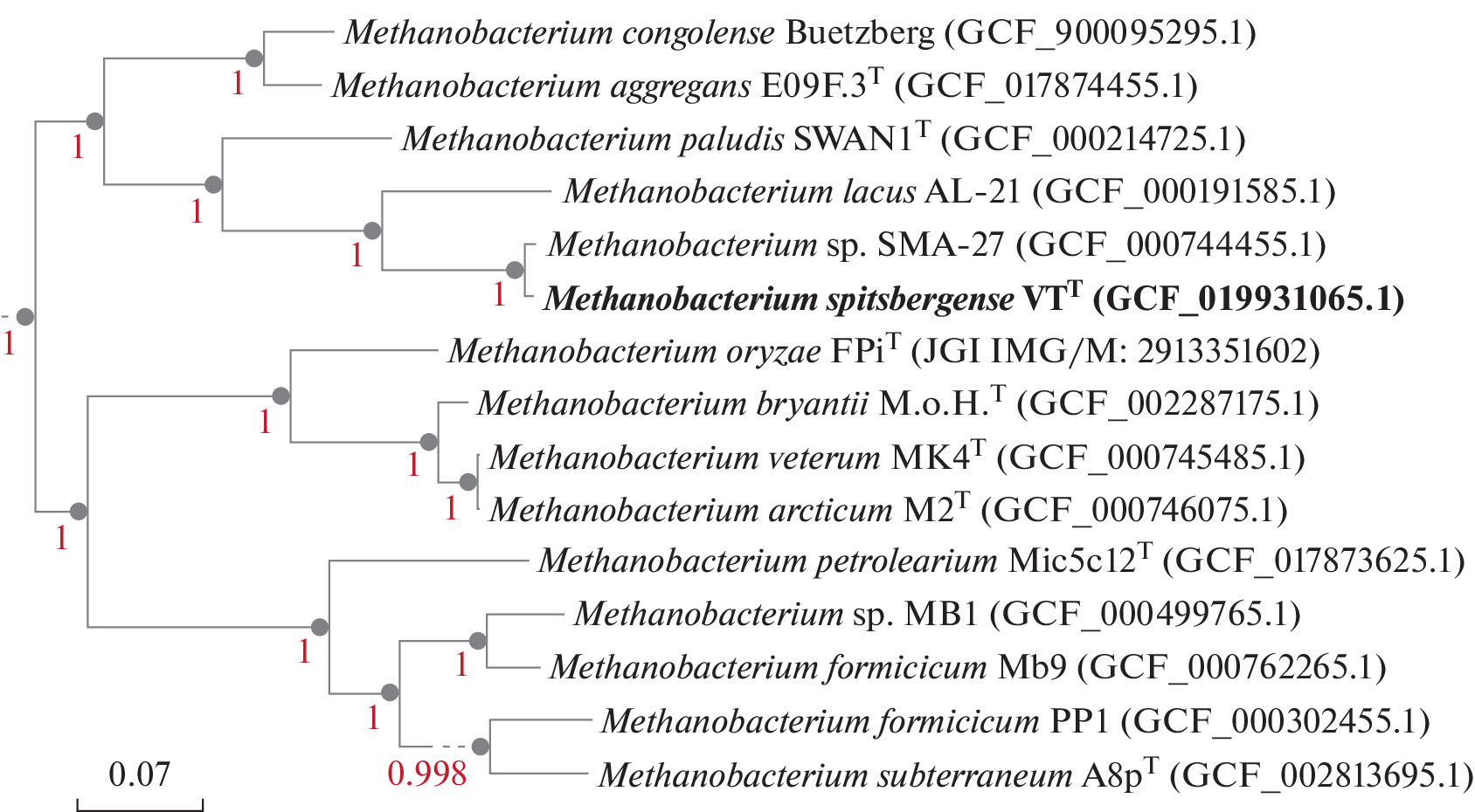 Из образца многолетнемерзлых отложений о. Западный Шпицберген выделен новый штамм метанобразующих архей, названный нами VTT. Клетки штамма представлены изогнутыми неподвижными палочками размером 2.7‒5.3 × 0.3 мкм. Оптимальными условиями для роста были температура 20°C, pH 6.6, содержание NaCl 0.03‒0.05 M. Единственным используемым субстратом являлась газовая смесь H2/CO2. В присутствии H2/CO2 рост стимулировался добавлением дрожжевого экстракта и жидкости рубца. По результатам филогенетического анализа последовательностей гена 16S рРНК штамм VTT отнесен к роду Methanobacterium с ближайшим родственником M. lacus 17A1T (сходство 97.02%). Сравнение секвенированного и собранного генома штамма VTT с геномами других видов рода подтвердило эти данные, а также показало их отличия на видовом уровне. По результатам проведенных исследований мы полагаем, что выделенный нами метаноген является представителем нового вида метанообразующих архей, для которого предложено название Methanobacterium spitsbergensе sp. nov. с типовым штаммом VTT (=VKM B-3566T = JCM 39284T).