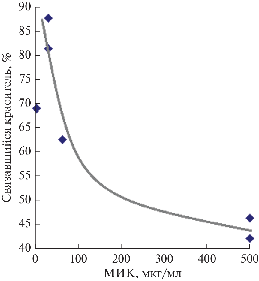 Abstract—Inhibitory effect of chitosan (molecular mass 28 kDa, deacetylation 94%) and of its quaternized derivative with 60% substitution on bacteria of various taxonomic groups was investigated. Bacteria differing in the cell wall surface characteristics and affinity to dyes were found to differ in theri sensitivity to chitosan. Correlation dependencies between antibacterial activity of quaternized chitosan and the surface characteristics of bacterial cell walls were revealed.