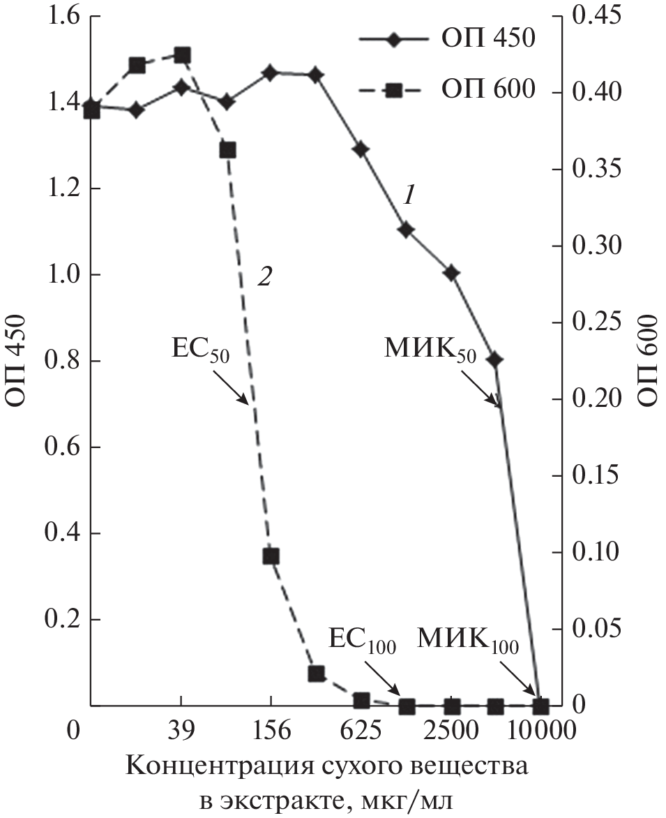 Abstract—The goal of the study was to investigate the mechanism of quorum sensing (QS) inhibition in the model bacterium Chromobacterium subtsugae 026 (previously – C. violaceum 026) by Eucalyptus viminalis Labill leaf extract, and to identify the plant-derived components that provide this biological activity. The raw extract showed pronounced anti-QS activity within a broad concentrations range which were an order of magnitude lower than required for bacterial growth suppression (the MIC50/EC50 ratio of 43.6). Chemical analysis of the extract revealed six small plant-derived molecules: pyrogallol, 2,3-dihydro-3,5-dihydroxy-6-methyl-4H-pyran-4-1, p-cymene, 4-((1E)-3-hydroxy-1-propenyl)-2-methoxyphenol, gallic and palmitic acids, whose inhibitory effect on QS in Chromobacterium spp. has previously been shown by in vitro experiments or predicted by in silico models. In addition, minor components γ-caprolactone and γ-octanolactone, structurally similar to acylated homoserine lactones, QS autoinducers in Chromobacterium spp., were found in the extract. Chemically synthesized analogs of these molecules showed anti-QS activity in the C. subtsugae 026 bioassay (ЕС50 = 354.2 and 145.6 µg/mL, respectively). Enrichment of the E. viminalis leaf extract with γ-caprolactone or γ-octanolactone significantly increased the anti-QS activity of these compositions, which was determined by isobolographic analysis as additive or superadditive effects.