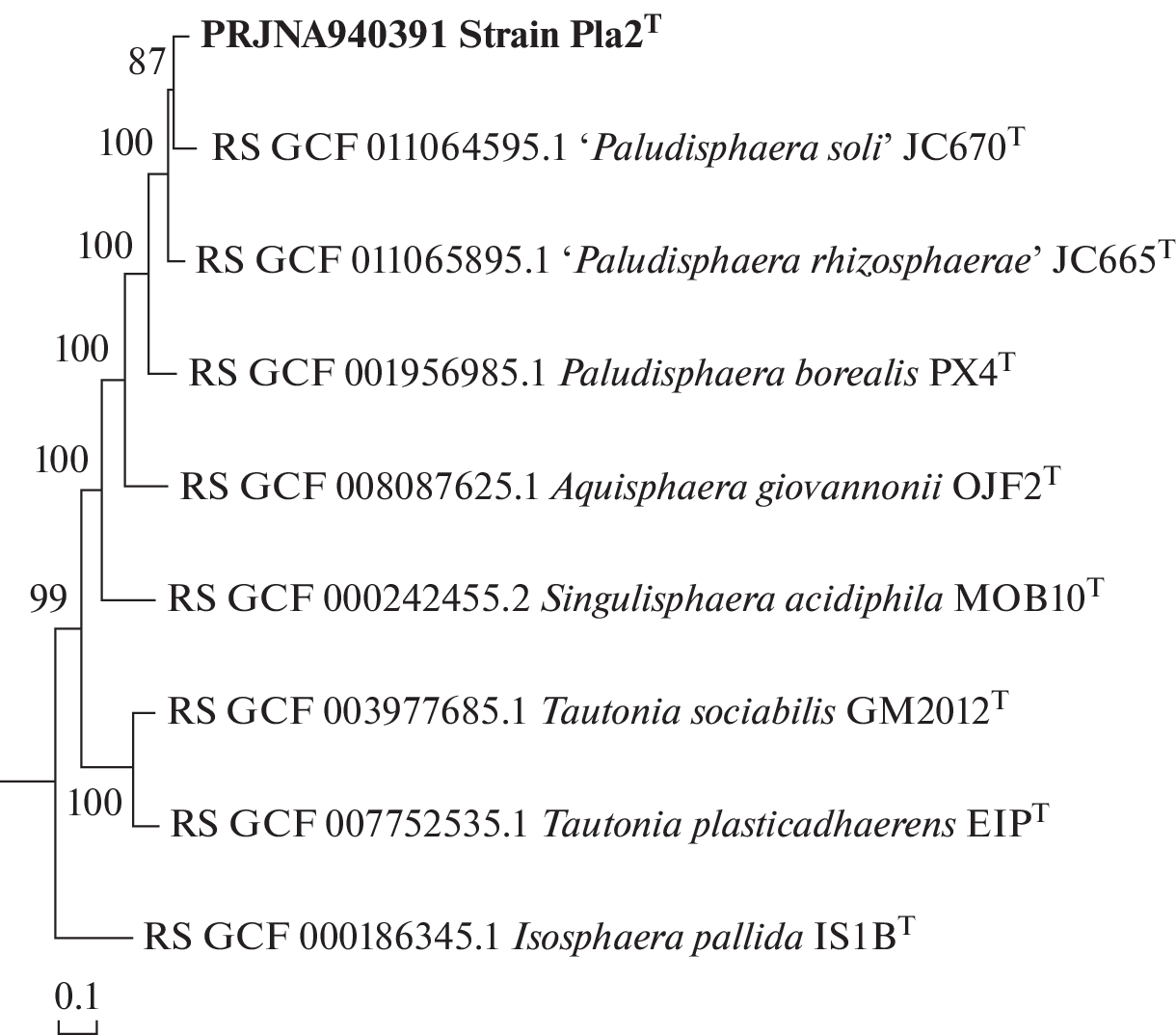 Abstract—Planctomycetes are common inhabitants of northern wetland ecosystems. In this study, a new planctomycete of the genus Paludisphaera, strain Pla2T, was isolated from a boreal fen in Russia. The novel isolate was represented by nonmotile, pink-pigmented, spherical cells that multiplied by budding and occurred singly or were assembled in small aggregates. Strain Pla2T was a chemoorganotrophic, psychrotolerant mesophile with a growth optimum at pH 5.5‒6 and 15‒20°C. The preferred growth substrates were polysaccharides, including xylan, xanthan gum, and phytagel, as well as some sugars. The 16S rRNA gene sequence of strain Pla2T displayed the highest similarity (97.9%) to that of ‘Paludisphaera soli’ JC670T isolated from highland soil of the western Himalayas. With other members of the genus Paludisphaera, “P. rhizosphaerae” JC665T and P. borealis PX4T, this similarity was 97.0 and 93.8%, respectively. The genome of strain Pla2T was 8.21 Mb in size and contained about 6500 protein-coding genes and 3 copies of the rRNA operon. The DNA G + C content was 67 mol %. The average nucleotide identity between the genome sequence of strain Pla2T and those of previously described members of the genus Paludisphaera was between 79.4 and 82.6%. This genotypic distance as well as several phenotypic differences allowed classifying the new planctomycete from a fen as representing a novel species of the genus Paludisphaera, Paludisphaera mucosa sp. nov. with the type strain Pla2T (=KCTC92668T = VKM B-3698T).