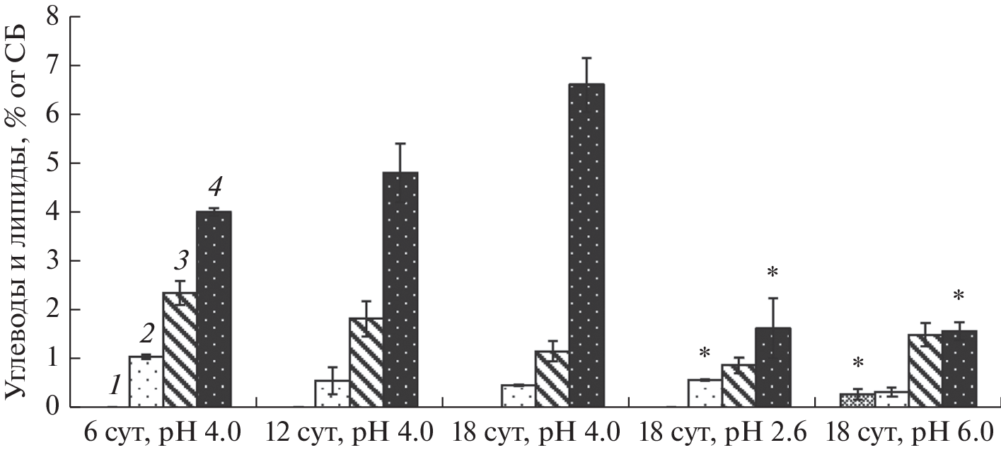 Исследование скорости роста гриба Sistotrema brinkmannii при различных значениях рН среды, температуры и концентрации NaCl показало, что он является мезофилом, предпочитает бессолевую среду и относится к облигатным ацидофилам, так как имеет выраженный оптимум роста при рН 3.0–4.0 и не растет при рН 7.0. Для изучения защитных механизмов, позволяющих грибу развиваться в кислых условиях среды, был исследован состав его осмолитов и липидов. Впервые показано, что в мицелии гриба в динамике роста в оптимальных условиях присутствует большое количество трегалозы (4.0–6.6% от сухой массы), что доказывает участие осмолитов в адаптации у ацидофилов. При этом на границах диапазона роста (рН 2.6 и 6.0) количество трегалозы в мицелии гриба снижалось в 2.5 раза, что соответствует узкому оптимуму роста гриба в природных условиях (рН 3.0–4.0). Отличительной чертой состава мембранных липидов гриба является высокая доля сфинголипидов (до 60% от суммы), которая в динамике роста в оптимальных условиях снижается вдвое. К основным мембранным липидам, кроме сфинголипидов, также относятся фосфатидные кислоты, фосфатидилэтаноламины и стерины, доля которых с возрастом увеличивается. Состав мембранных липидов гриба при рН 2.6 практически не отличается от оптимальных условий, тогда как в околонейтральной области наблюдается двукратное повышение доли сфинголипидов, что указывает на их адаптивное значение. Одновременное снижение доли сфинголипидов и рост уровня трегалозы в динамике роста позволяет предположить взаимосвязь этих соединений в защите мембран клетки.