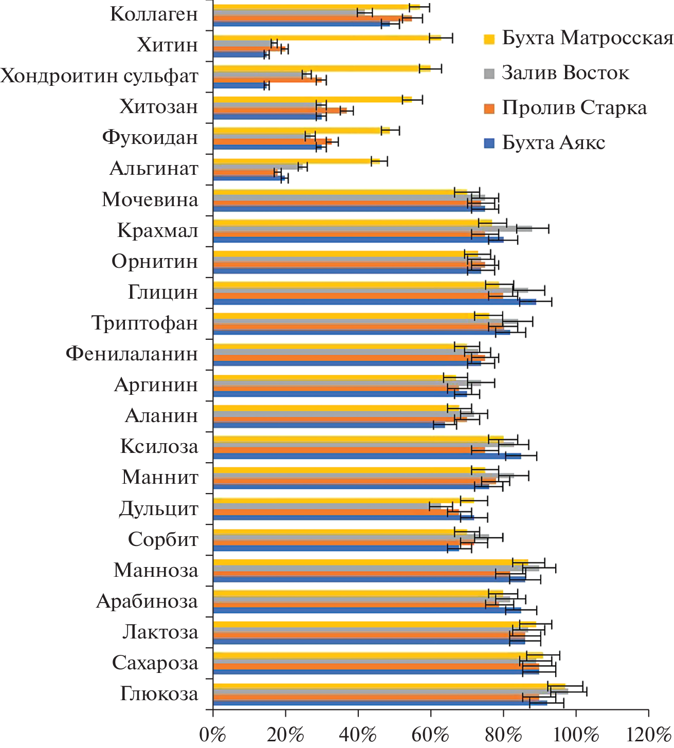 Abstract—Biodiversity of the bacterial communities in the digestive system of Crenomytilus grayanus inhabiting the coastal Sea of Japan waters with chronic anhropogenic pollution was investigated using metabarcoding. Apart from marine bacteria, the taxa typical under contamination with oil (Rhodobacteraceae, Corynebacteriaceae), heavy metals (Asinibacterium), and unprocessed municipal waste (Cloacibacterium, Globicatella) were revealed in the microbiota. A collection of 411 cultured heterotrophic bacterial strains isolated in the course of this study was characterized taxonomically. The intestinal microbiome of the studied mollusks was shown to have a unique composition, depending on their habitat. Ability of bacterial strains isolated from the C. grayanus digestive system to degrade various nutrient substrates (sugars, amino acids, and polysaccharides) and xenobiotics (oil hydrocarbons, bisphenol A, and atrazine) was studied. Most isolates degraded a broad range oforganic substrates; 13% (54 strains) oxidized oil hydrocarbons; 1% (4 strains) oxidized bisphenol A; and 0.5% (2 strains) degraded atrazine. The possible role of the microbiome C. grayanus microbiome in symbiotic digestion and in detoxication of the mollusk is discussed.