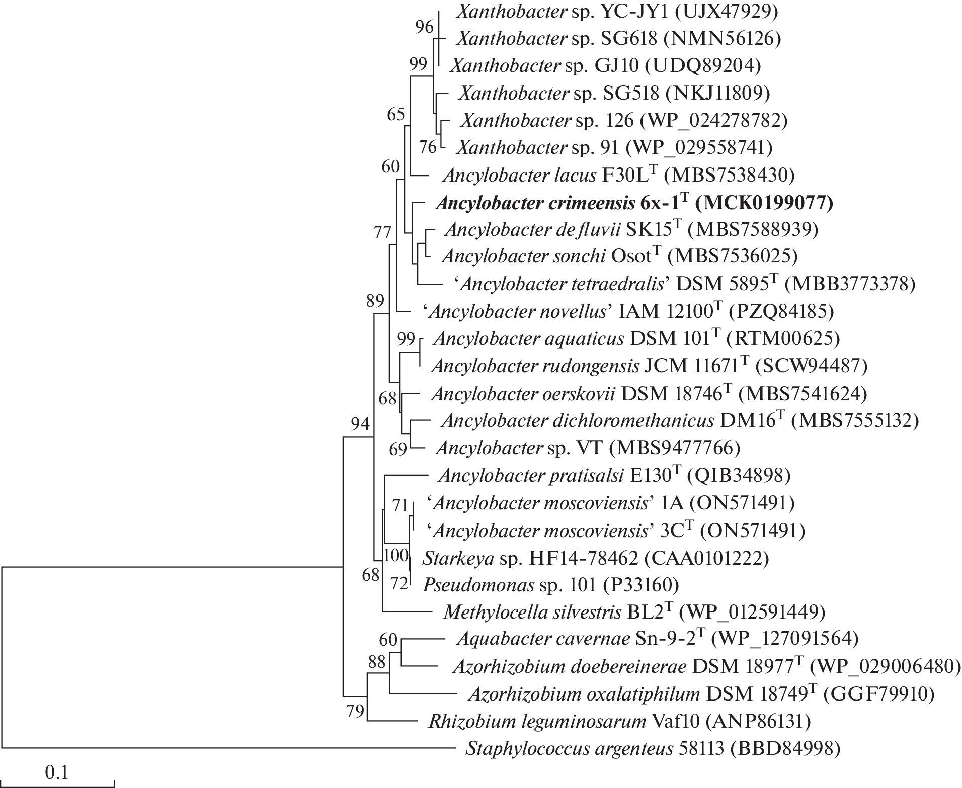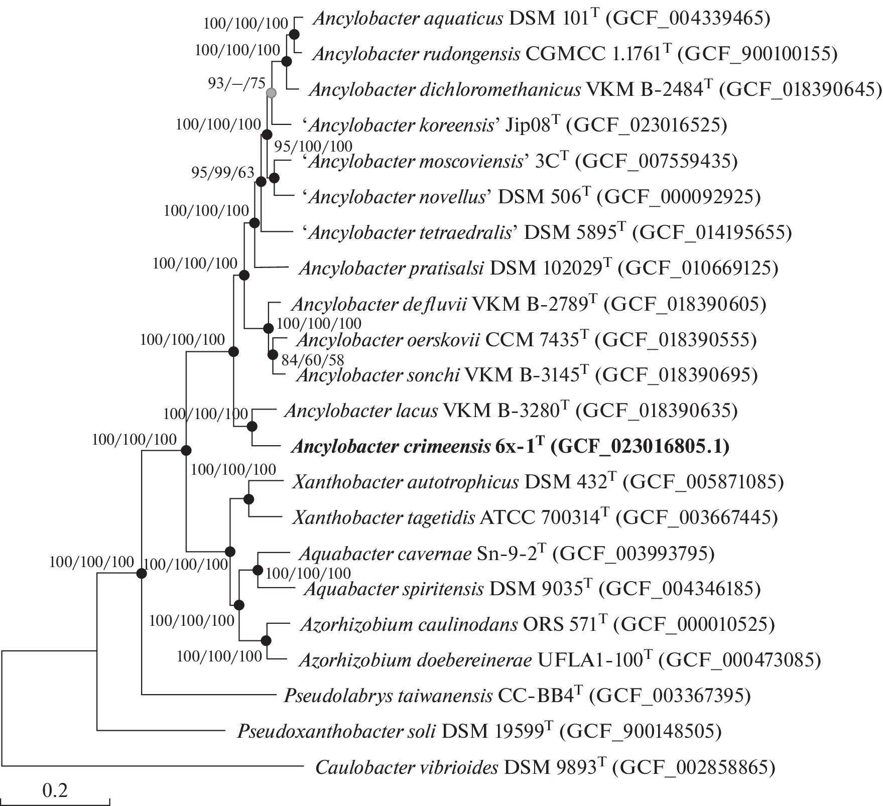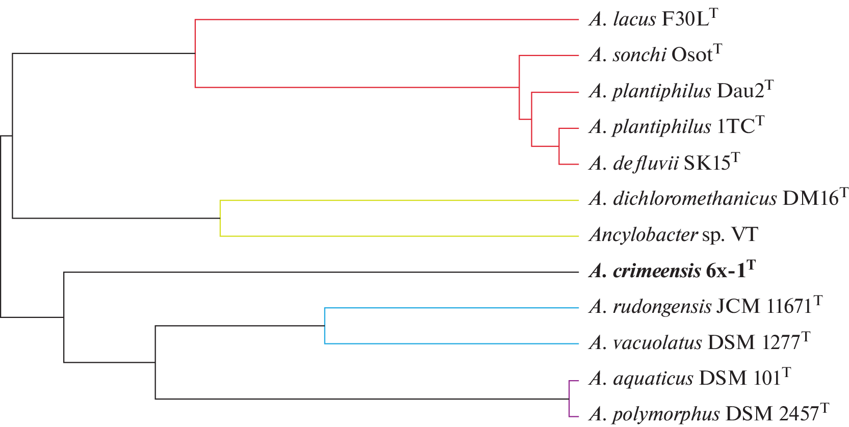 A new facultative methylotroph, strain 6x-1T, was isolated from the phyllosphere of oak (Quercus pubescens Willd.) on the medium with methanol. Cells were aerobic, gram-negative, not-spore-forming, non-motile short ovoids rods reproducing by binary fission. Growth optimum was at 25‒29°C and pH 7.0‒7.5; growth was inhibited by 1.5% NaCl. Predominant fatty acids were C18:1ω7c and C19:0cyclo. Predominant phospholipids were phosphatidylethanolamine, phosphatidylmonomethylethanolamine, and diphosphatidylglycerol. Tha major ubiquinone was Q10. The 16S rRNA gene sequence of strain 6x-1T exhibited the highest similarity to those of members of the genus Ancylobacter (97.0‒97.4%). Genome analysis of strain 6x-1T and most closely related Ancylobacter strains revealed that the values of ANI (80.7‒83.5%), dDDH (22.4‒23.3%), AAI (72.0‒78.0%), and POCP (62.0‒69.0%) were below the recommended threshold values for prokaryotic species. Genome size of strain 6x-1T was 4.29 × 106 Mb, and G + C content was 67.3%. According to the results of phylogenetic, phylogenomic, phenotypic, and chemotaxonomic analysis, strain 6x-1T (=VKM В-3256T = ССUG 72401T) represents a new species of genus Ancylobacter, for which the name Ancylobacter crimeensis sp. nov. is proposed.