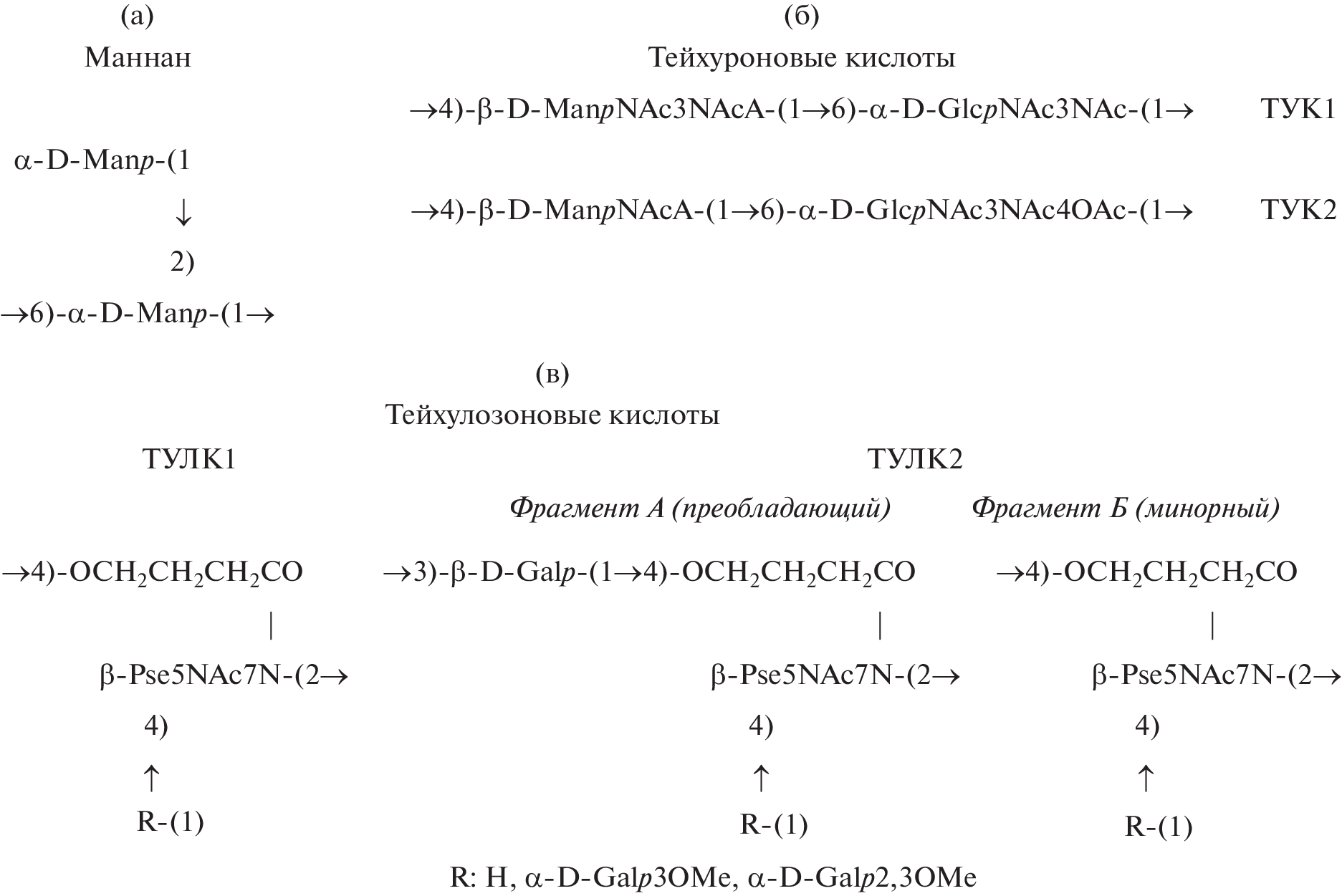 - Shashkov A.S., Tul’skaya E.M., Potekhina N.V., Dmitrenok A.S., Senchenkova S.N., Zaychikov V.A., Dorofeeva L.V., Evtushenko L.I. D-Rhamnan and pyruvate-containing teichuronic acid from the cell wall of Rathayibacter sp. VKM Ac-2759 // Biochemistry (Moscow). 2021. V. 86. P. 506–516.