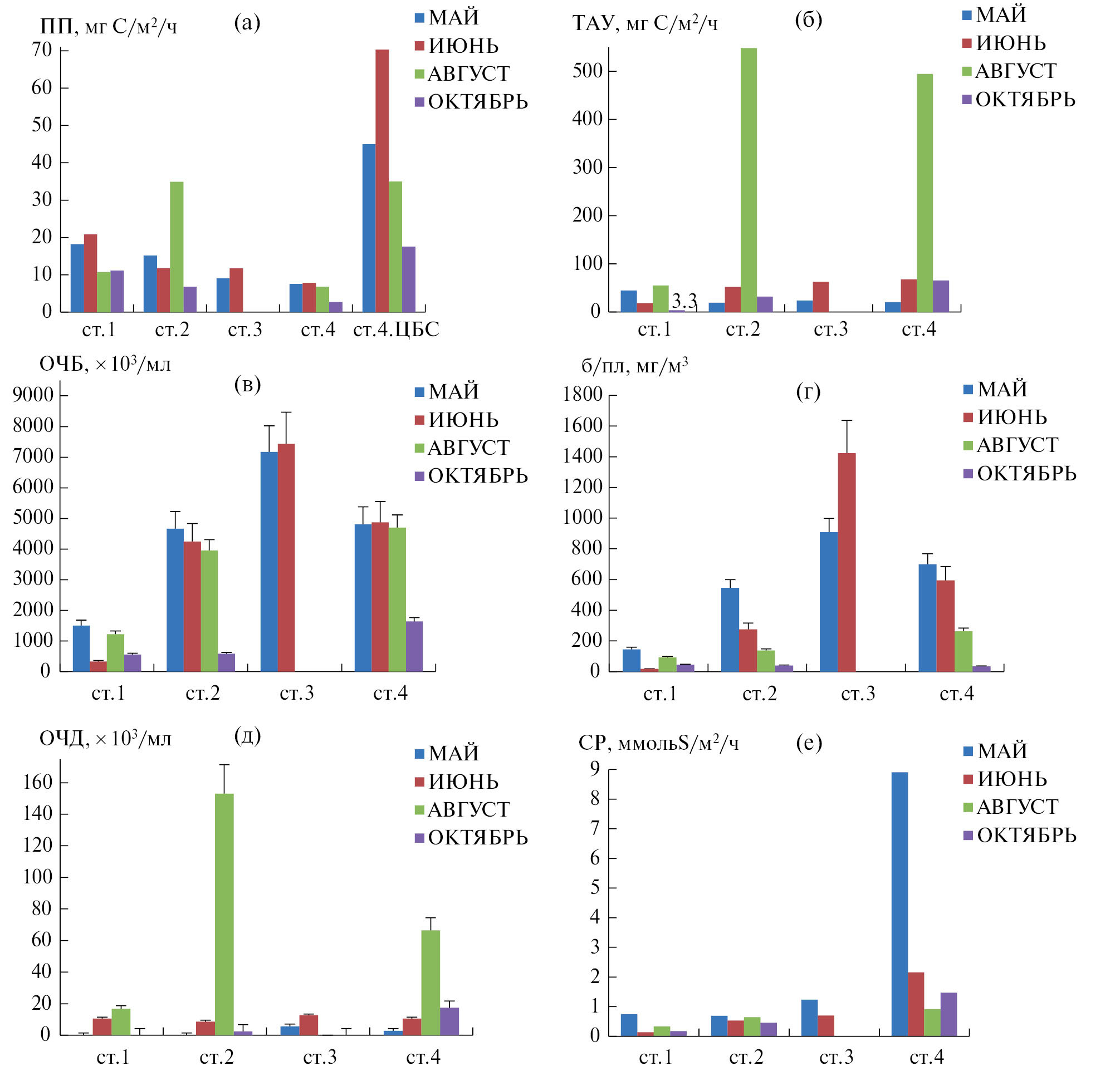 Рис. 1. Характеристики микробных сообществ: а — интегральная первичная продукция (ПП) в планктоне (ст. 1–4) и цианобактериальных сообществах (ЦБС) для ст. 4; б — интегральные значения темновой ассимиляции углекислоты (ТАУ) в горизонте 0–20 см; в — общая численность бактериопланктона (ОЧБ); г — биомасса бактериопланктона (б/пл); д — общая численность диатомовых водорослей (ОЧД); е — интегральные значения сульфатредукции (СР) в горизонте 0–20 см.