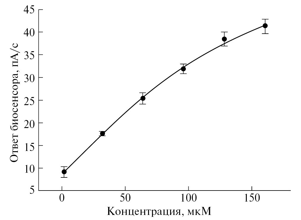 Для изучения влияния концентраций карбендазима на потребление кислорода ИмК концентрации субстрата варьировали в диапазоне от 2 до 160 мкМ. На рис. 1 представлена градуировочная кривая зависимости ответа биосенсора от концентрации карбендазима.