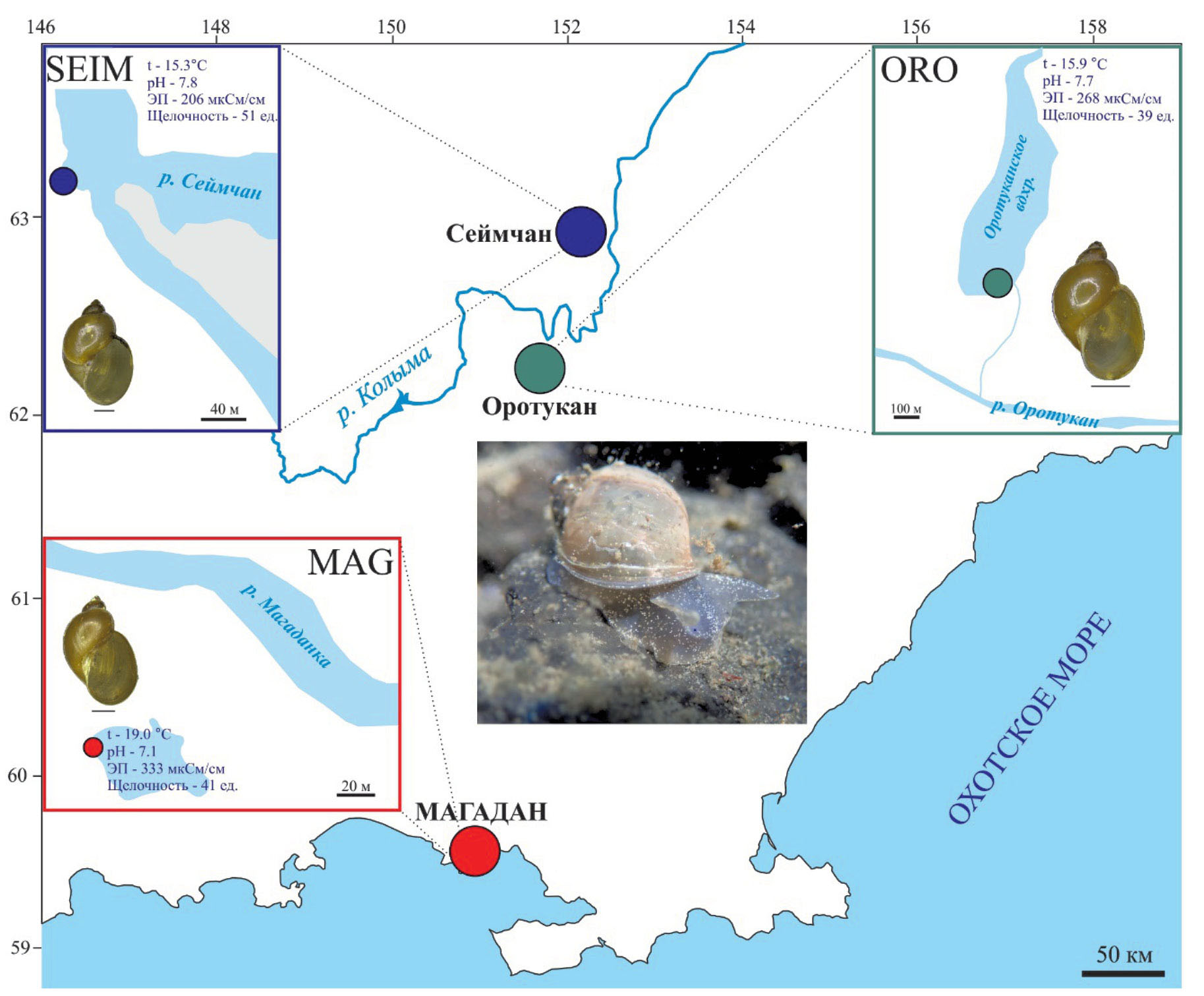 Экземпляры моллюсков были отобраны в августе 2022 года в Магаданской области по 4‒5 экземпляров из пойменного озера р. Магаданка на окраине г. Магадан (59.5478 с. ш., 150.8758 в. д.), водохранилища близ пгт. Оротукан (62.2672 с. ш., 151.7030 в. д.), и р. Сеймчан в 16 км выше впадения в реку Колыма (63.0302 с. ш., 152.2764 в. д.) (рис. 1).