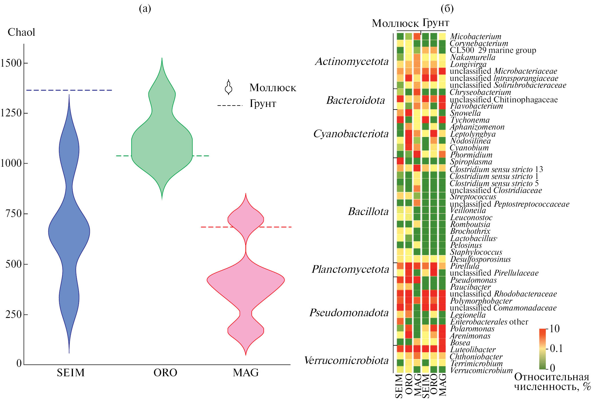 В результате нами были установлены различия в α-разнообразии бактериальных сообществ, ассоциированных с моллюсками (рис. 2а).