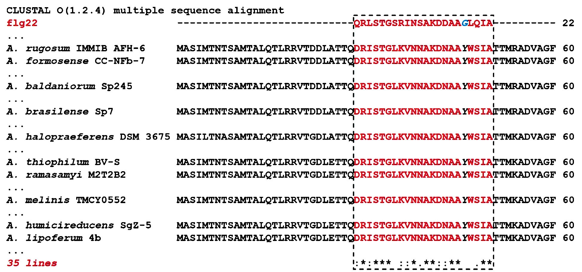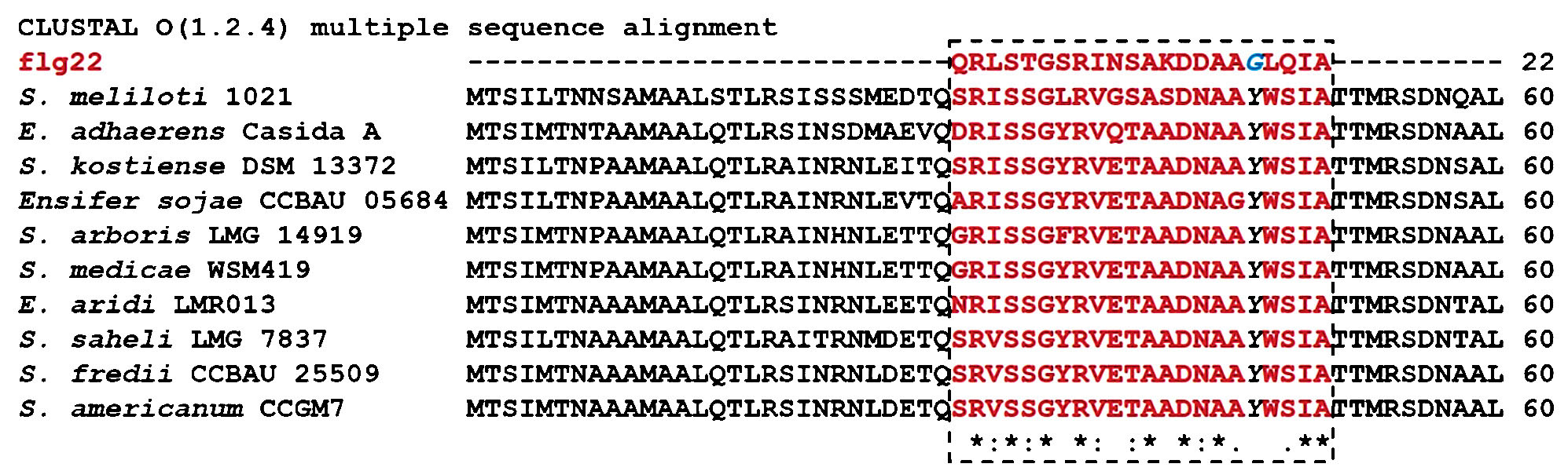 На дополнительном рис. S2 представлен фрагмент полученного нами МВП для флагеллинов из патогенов и PGPR семейства Azospirillaceae, иллюстрирующий такую замену во флагеллинах представителей PGPR. Это исключает образование отмеченного выше тримера, но не препятствует взаимодействиям между FLS2 и аналогами flg22 (Sun et al., 2013), что может служить сигналом для растения к установлению ассоциативных взаимоотношений с представителями PGPR (Проворов и соавт., 2018).