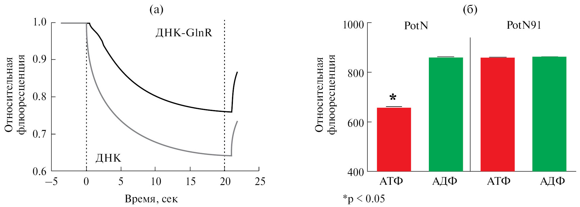Снижение флуоресценции коррелирует с повышением массы молекулы/комплекса. В присутствии АТФ флуоресценция была в 2 раза ниже, следовательно, ДНК более подвижна за счет малой эффективности образования комплекса ДНК‒GlnR. Это, по всей вероятности, происходит за счет того, что GlnR связан с PotN. Наоборот, в присутствии АДФ наблюдается высокий уровень флуоресценции (рис. 2б). Следовательно, образуется комплекс ДНК‒GlnR, в то время как PotN, скорее всего, находится в комплексе с PotA. Чтоб доказать роль АТФ и АДФ в этом процессе, этот эксперимент был проведен с белком PotN91, неспособным связывать нуклеотиды (Iskhakova et al., 2022). Как видно из рис. 2, в присутствие PotN91 внесение АТФ и АДФ не влияло на подвижность ДНК.