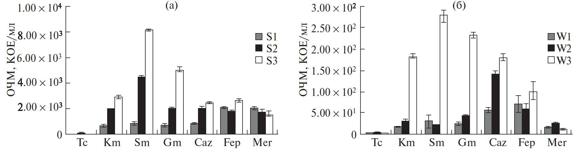 Рис. 1. Общая численность антибиотикоустойчивых микроорганизмов (КОЕ/мл образца), изолированных методом прямого высева из проб седиментов (а) и воды (б) реки Ока. Tc ‒ тетрациклин, Km ‒ канамицин, Sm ‒ стрептомицин, Gm — гентамицин, Caz — цефтазидим, Fep — цефепим, Mer — меропенем.