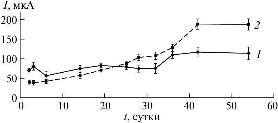 Рис. 1. Электрический ток во внешней цепи биоэлектрохимической системы в зависимости от наличия (1) или отсутствия (2) нефтяного загрязнения