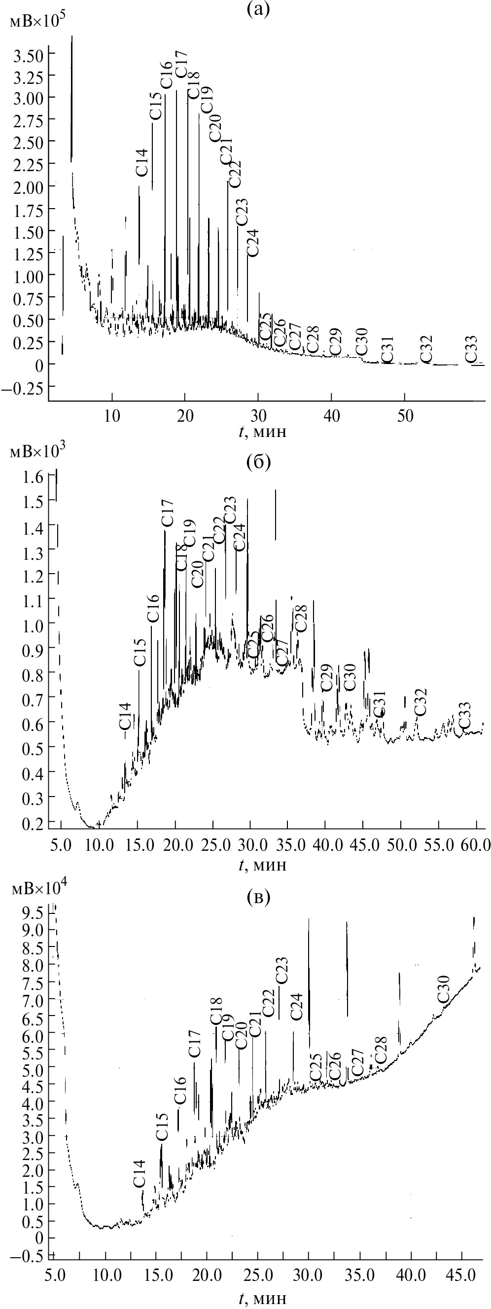 Рис. 2. Хроматограммы исходной сырой нефти (а), остаточных углеводородов в контроле (б) и биоэлектрохимической системе (в)