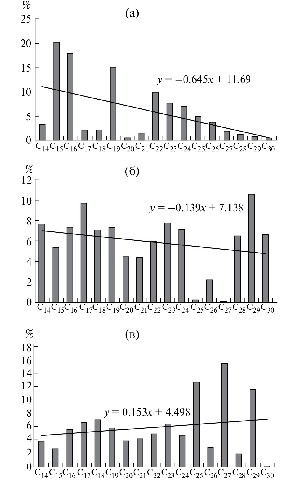 Исходная сырая нефть, использованная для внесения в донные отложения (рис. 3а), демонстрировала значительное преобладание легких гомологов н-алканов с постепенным практически линейным убыванием до С30H62. Остаточные углеводороды, после двухмесячной деградации без биоэлектрохимической стимуляции в контроле (рис. 3б), имели уже более сходную представленность практически всех гомологов относительно таковых в исходной нефти, что может быть объяснено более высокой биологической доступностью и, соответственно, интенсивной деградацией легких соединений исследованного диапазона при сохранении более тяжелых алканов. Образцы из биоэлектрохимически активной приэлектродной зоны микробного топливного элемента отличались балансом остаточных фракций, уже заметно смещенным в сторону преобладания более длинноцепочечных углеводородов, что хорошо иллюстрируется противоположным наклоном линий тренда (рис. 3в) по сравнению с контролем (рис. 3б). Баланс гомологов также иллюстрируется знаками при коэффициентах наклонов уравнений линий трендов, отрицательных в случае сырой нефти, контроля и положительных в биоэлектрохимически активной приэлектродной зоне.