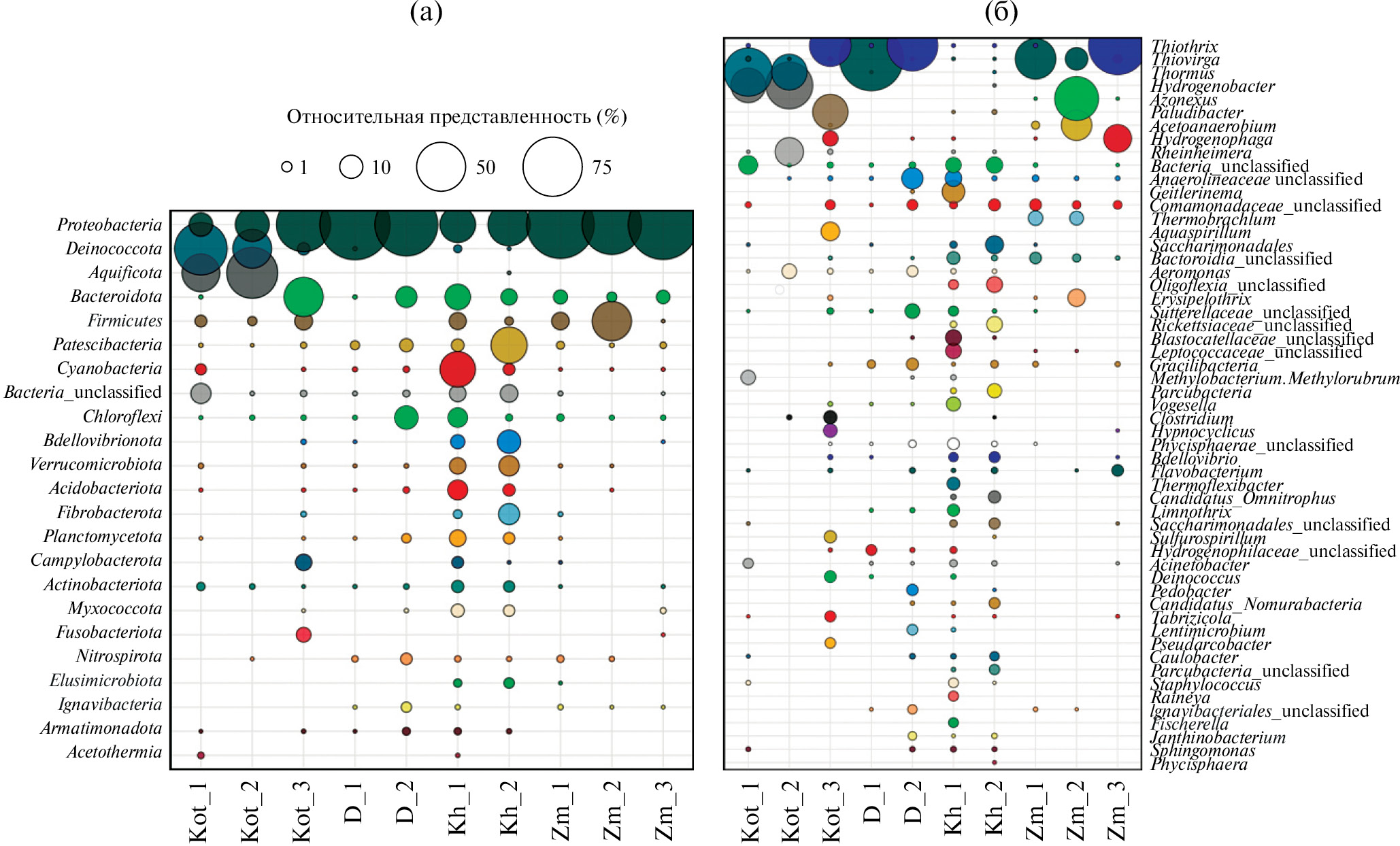 Представители филумов Candidatus Patescibacteria, Nitrospirota, Cyanobacteria, Chloroflexi, Deinococcota и Bacteroidota составляли менее 1%. В изливе источника Котельниковский (Кot_1) основную часть микробного сообщества составляли Deinococcota – 53.2%, Aquificota – 26.2%, Proteobacteria – 9.1%, не классифицируемые Bacteria – 6.4%, Firmicutes – 1.7% и Cyanobacteria – 1.4%. Филумы Deinococcota и Aquificota представлены ОТЕ, принадлежащим родам Thermus и Hydrogenobacter соответственно. К минорным компонентам микробного сообщества относились представители филума Desulfobacterota (р. Caldimicrobium – факультативно литоавтотрофные, анаэробные бактерии с оптимумом роста 75°C), Ca. Acetithermota и Armatimonadota (Oren, Goker, 2023). В микробном сообществе Кot_2, в сравнении с изливом источника, увеличилась доля представителей рода Hydrogenobacter (50%) и уменьшилась рода Thermus (28%). Термофильные и гипертермофильные бактерии, обнаруживаемые в геотермальных системах, нефтяных резервуарах, анаэробных реакторах и очистных сооружениях, относящиеся к родам Fervidobacterium (Thermotogota), Caldisericum (Caldisericota), JS1_ge (в н. в. Atribacterota) (Oren, Garrity, 2021), находились в числе минорных представителей. В месте впадения источника Котельниковский в оз. Байкал (Кot_3) увеличивается доля Proteobacteria (57%) и Firmicutes (4.8%). В сообществе Кot_3 выявлены ОТЕ, отнесенные к Bacteroidota (28.2%), Campylobacterota (4%), Fusobacteriota (3%) и Deinococcota (2%). Менее 1% составляли последовательности представителей Ca. Patescibacteria, Fibrobacterota, Bdellovibrionota и Chloroflexi.