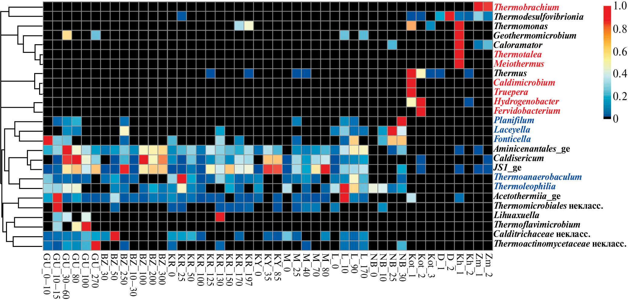 Рис. 2. Тепловая карта (heat map) распределения последовательностей термофильных бактерий на уровне рода в библиотеках фрагментов гена 16S рРНК микробных сообществ воды горячих источников и донных осадков оз. Байкал. Данные об относительной численности ОТЕ нормализованы путем унификации с нулевым минимумом [(x-min)/range]. Последовательности, обнаруженные только в горячих источниках, выделены красным цветом; только в донных осадках – синим; и в донных осадках, и в горячих источниках – черным
