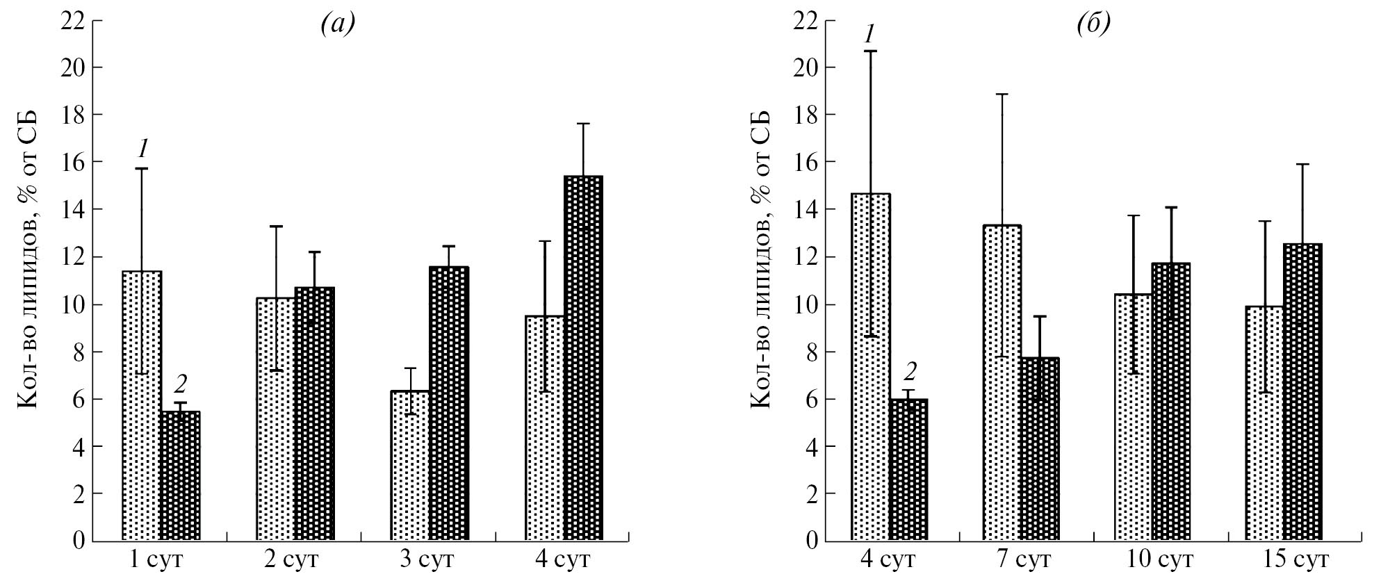 Рис. 3. Количество мембранных и запасных липидов гриба при 20°С (а) и 4°С (б): 1 ‒ мембранные липиды, 2 ‒ запасные липиды.