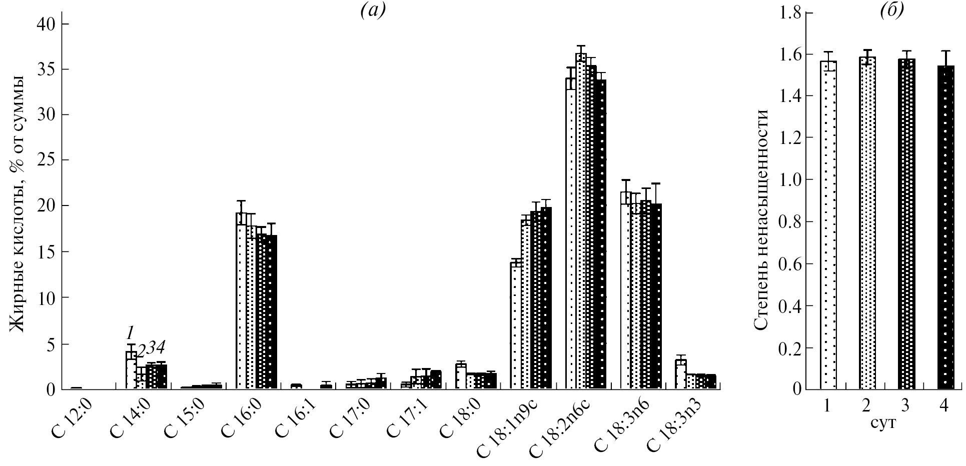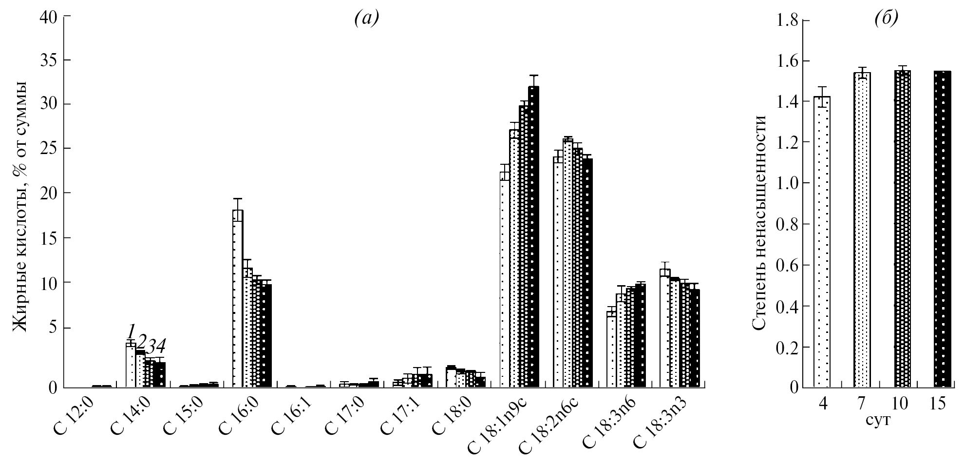 Рис. 6. Жирнокислотный состав мембранных липидов (а) и их степень ненасыщенности (б) в динамике роста M. flavus при 20°С. 1 ‒ 1 сут, 2 ‒ 2 сут, 3 ‒ 3 сут, 4 ‒ 4 сут.