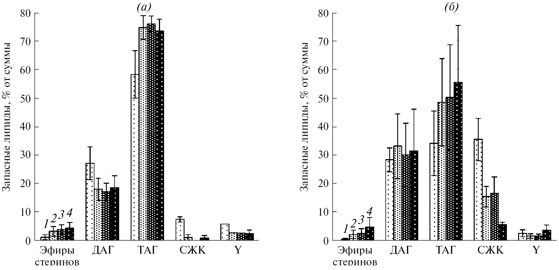 Рис. 8. Состав запасных липидов в динамике роста M. flavus при 20°С (а) и при 4°C (б). МАГ ‒ моноацилглицериды, ДАГ ‒ диацилглицериды, ТАГ ‒ триацилглицериды, СЖК ‒ свободные жирные кислоты, Y ‒ неидентифицированные липид. (а): 1 ‒ 1 сут, 2 ‒ 2 сут, 3 ‒ 3 сут, 4 ‒ 4 сут; (б): 1 ‒ 4 сут, 2 ‒ 7 сут, 3 ‒ 10 сут, 4 ‒ 15 сут.