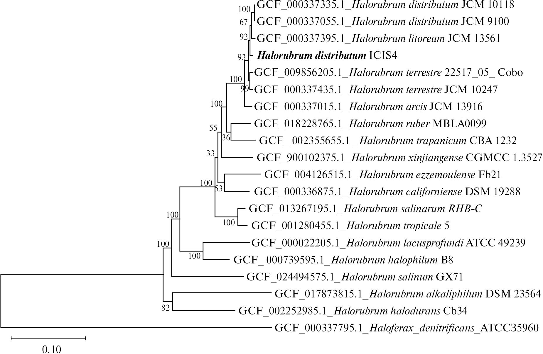 Геном штамма ICIS4 оказался наиболее сходным с H. litoreum JCM 13561 по всем трем показателям: ANI (98.05%), OrthoANI (98.08%) и AAI (97.93%). Сходство с геномами других штаммов также было высоким: 97.71 и более ‒ по данным ANI теста и 97.50 и более – по AAI, что выше общепринятого уровня видовых различий (Chun et al., 2018). Филогеномный анализ с использованием базы данных GenBank показал, что штамм ICIS4 входит в кластер вида H. distributum Zvyagintseva and Tarasov 1989; Oren and Ventosa 1996 (дополнительные материалы, рис. S1), к которому, согласно расширенному описанию, относятся штаммы H. distributum и H. terrestre, выделенные из засоленных почв, H. arcis из соленого озера и H. litoreum из пруда для выпаривания соли (Infante-Domínguez et al., 2020).