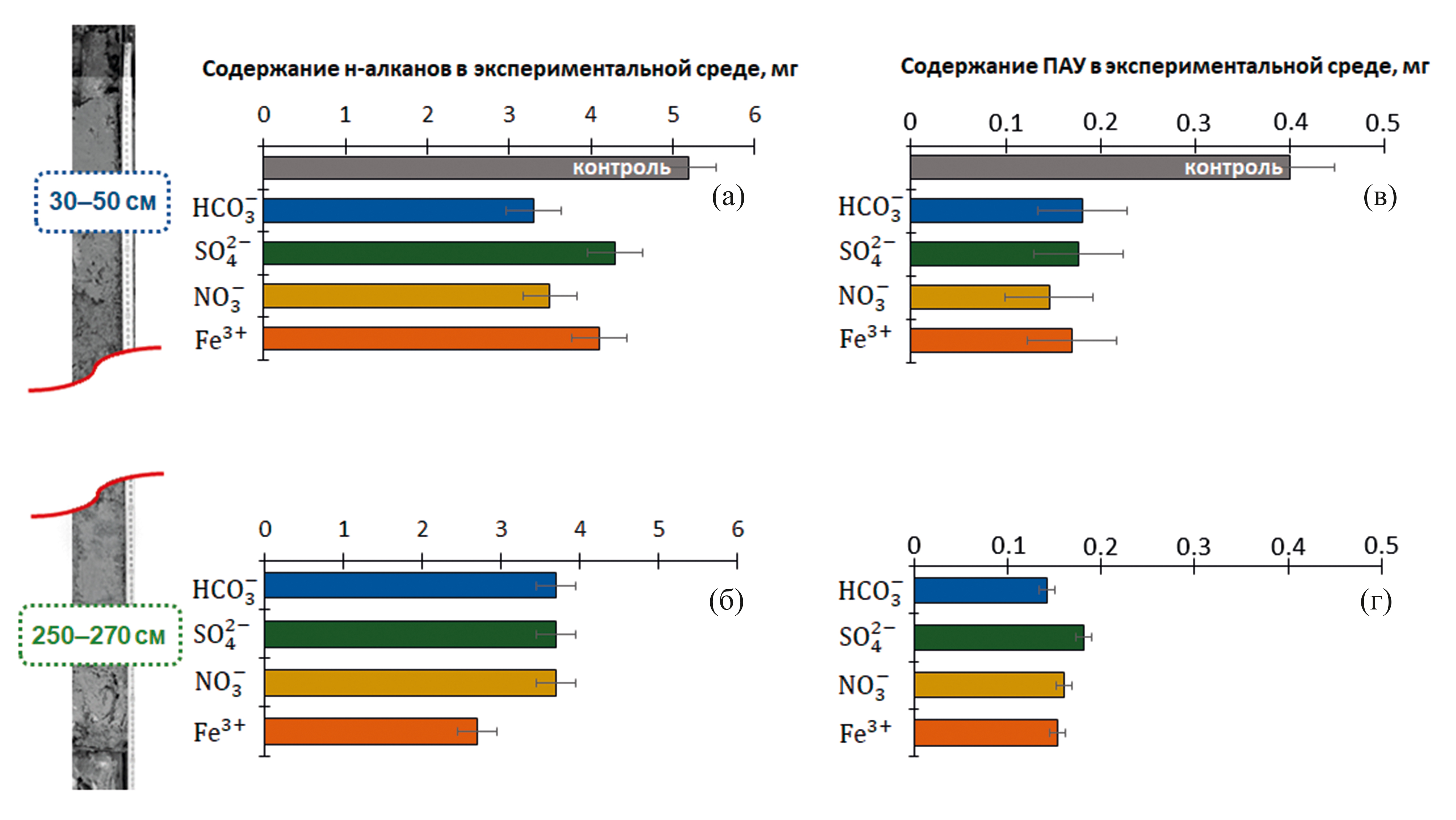 Деградация углеводородов в условиях эксперимента. Накопительные культуры, полученные на средах с разными акцепторами электронов и нефтью, в течение одного года показали различную степень конверсии н-алканов и ПАУ (рис. 2).