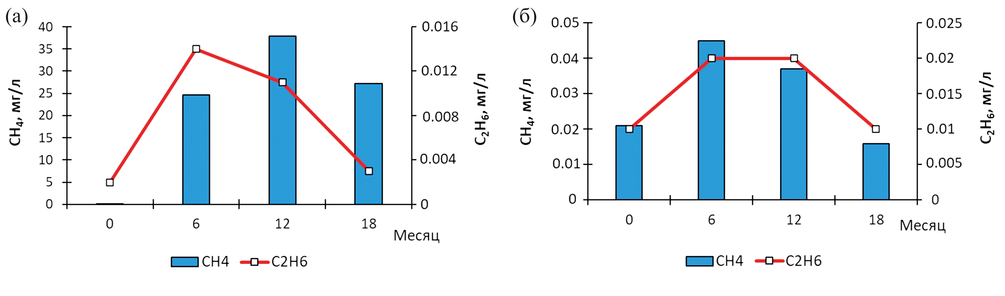 Рис. 3. Динамика образования метана и этана в накопительных культурах, содержащих подповерхностные (а) и глубинные (б) осадки, обогащенных гидрокарбонат-ионом.