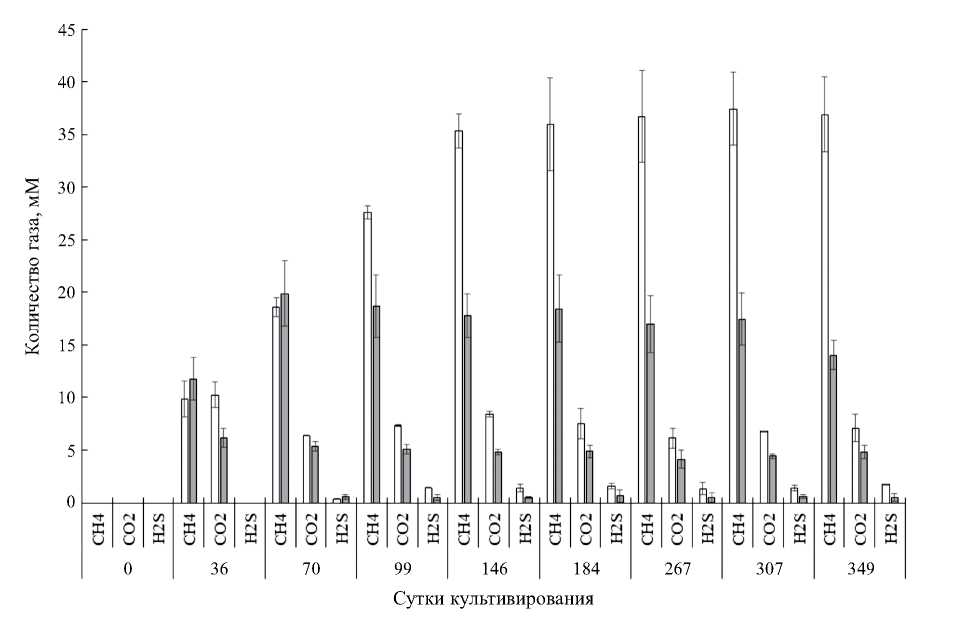 Наибольшая разница возникла на 349-е сут культивирования и составила 22.9 мМ метана. Продукция CO2 в СР условиях с ВПС превышала данные показатели для вариантов без пластика на 10% и это соотношение сохранялось на протяжении всего опыта. Сероводород появился в пробах только после 70 сут культивирования, и его количество во флаконах с ВПС продолжало расти за время опыта. В среднем содержание сероводорода в образцах с пластиком было в 2.5‒3 раза выше, чем в контрольных вариантах.