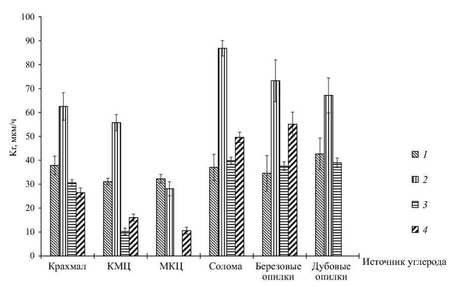 Динамика роста стрептомицетов на разных средах при одинаковых условиях инкубации была неодинакова. Так, S. thermocarboxydus T1-3 развивался на всех модельных источниках целлюлозы с высокой скоростью, близкой к росту на среде с крахмалом (63 ± 6 мкм/ч), за исключением среды с МКЦ (Кr = 29 ± 13 мкм/ч) (рис. 3).