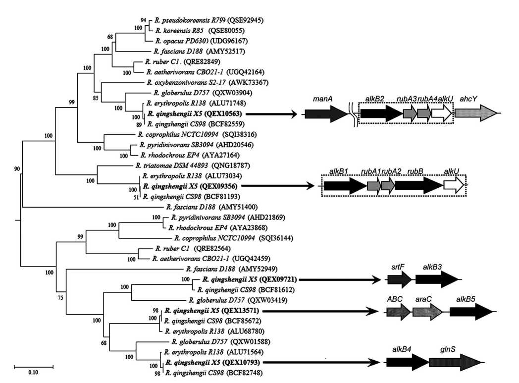 В соответствии с представленной в базе данных GenBank аннотацией, в геноме штамма R. qingshengii Х5 содержатся 5 генов алкан монооксигеназ AlkB-типа, все имеют хромосомную локализацию. Впервые такое разнообразие генов alkB у родококков было показано в работе van Beilen et al. (2002). Затем этой же группой было предложено разделить обнаруженные гены на 4 группы, отличающиеся не только соответствующей кластеризацией нуклеотидных последовательностей, но и локализацией в характерных регионах генома, сохраняющих консервативность окружения (Whyte et al., 2002). Так, гены подтипа alkB1 располагались в кластере, включающем в себя гены других необходимых участников реакции гидроксилирования алканов: рубредоксина (две копии, rubA1 и rubA2) и рубредоксин редуктазы (rubB), также в кластер входит ген регуляторного белка AlkU, относящегося к семейству TetR. Ген alkB2 отличался отсутствием в кластере гена rubB, к консервативному окружению гена alkB3 относился ген сортазы класса F, а alkB4 ‒ глутамил-тРНК синтетазы (Whyte et al., 2002). Впоследствии были опубликованы работы, сообщающие об обнаружении новых подтипов генов alkB у родококков (Takei et al., 2008; Xiang et al., 2022). К настоящему времени для генов из окружения всех подтипов alkB, кроме 1 и 2, не известно никакой функциональной связи с потреблением алканов.