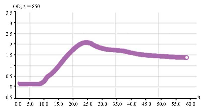 В результате культивирования в статических условиях за 58 ч эксперимента получена характеристика роста культуры L. brevis 2kGv 22-17. На основе данных по культивированию лактобактерий с использованием биореактора RTS-1C построен типовой график роста лактобактерий. Данные обработаны с помощью программного обеспечения Grant Instruments “Labvise”, которое позволяет контролировать рост микроорганизмов в режиме реального времени. В процессе культивирования использовалось вихревое перемешивание ингредиентов (Vortextypemixing) с интервалом в 10 мин. Адаптация микроорганизма к условиям культивирования длилась в течение 11 ч. С 12 по 21 ч отмечалась стадия экспоненциального роста, с последующим переходом в стадию стационарного роста, что соответствовало 2.14 OD и значениям µ (h ̄¹) – 0.02 в 130 точке измерения. Установлено, что антагонистическая активность выявляется в культуре в период экспоненциальной фазы, которая длилась в течение 9 ч. Также антибактериальная активность сохраняется в среде и при переходе развития культуры в стационарную стадию роста и продолжается в течение 37 ч (рисунок).