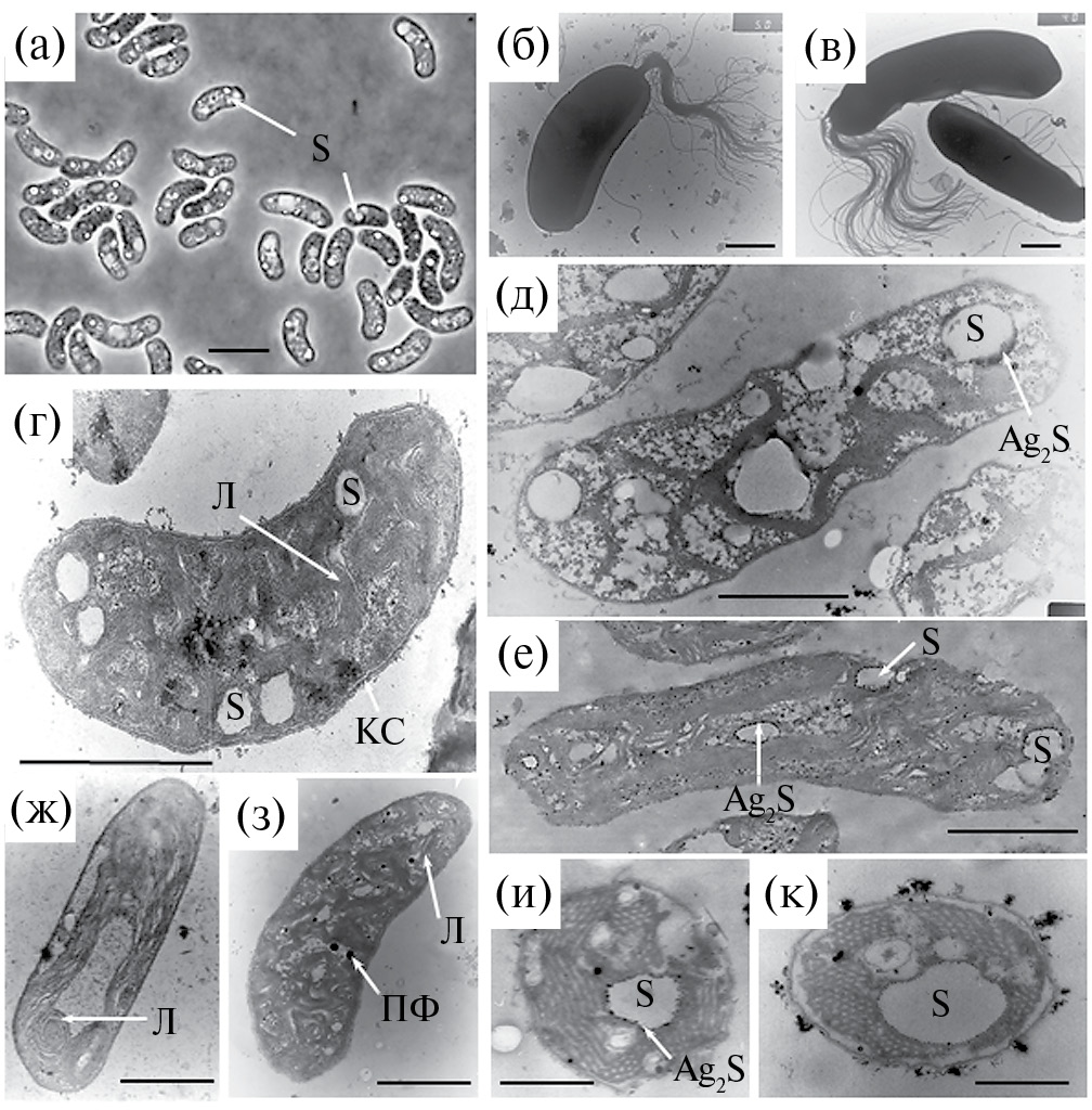 Рис. 1. Морфология и ультратонкое строение Trs. sibirica штаммов В8-1 (а), А12ᵀ (б–ж) и BG35 (з): а – световой микроскоп, фазовый контраст; б–в – электронный микроскоп, целые клетки; г, ж–з – электронный микроскоп, ультратонкие срезы; д–е – электронный микроскоп, ультратонкие срезы, клетки обработаны AgNO₃; и–к – электронный микроскоп, ультратонкие срезы, клетки обработаны AgNO₃, Thioalkalicoccus limnaeus A26ᵀ. Масштаб: (а) – 10 мкм; (б–з) – 2 мкм; (и–к) – 0.5 мкм. Обозначения: КС – клеточная стенка; Л – ламеллярные фотосинтетические структуры; ПФ – полифосфаты; S – элементная сера; Ag₂S – сульфид серебра.