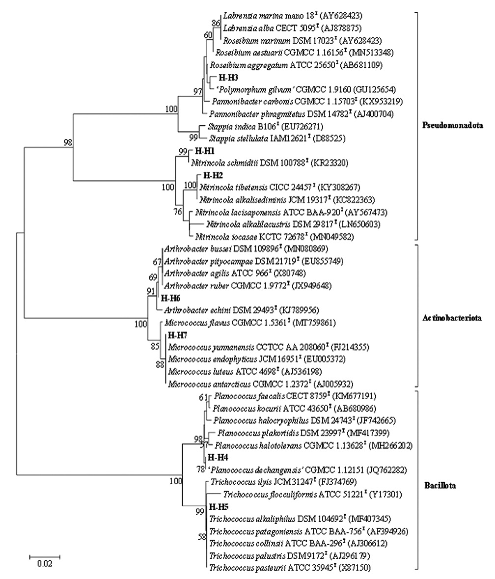 В результате анализа последовательностей фрагментов гена 16S рРНК выявлены представители филумов Pseudomonadota, Actinomycetota и Bacillota. Полученные культуры демонстрировали 98.49–100% сходства с ранее описанными типовыми штаммами. Согласно полученным данным, штаммы Н–Н1 и Н–Н2, выделенные из проб воды озера Нухэ-Нур, принадлежали к роду Nitrincola, семейству Oceanospirillaceae, порядку Oceanospirillales класса Gammaproteobacteria. Большинство представителей рода Nitrincola являются алкалофильными галотолерантными бактериями, типовые штаммы которых выделены преимущественно из содовых, соленых или щелочных озер в аридных и семиаридных районах по всему миру (Phurbu et al., 2019). Штамм Н–Н1 демонстрировал достаточно высокий уровень сходства с Nitrincola schmidtii DSM 100788T (99.14%), с которым объединялся на филогенетическом дереве с высокой достоверностью (99%), что позволяет предполагать их филогенетическую близость. Штамм Н–Н2 был близок к виду Nitrincola alkalisediminis JCM 19317T (98.49%), однако на филогенетическом дереве формировал отдельную ветвь, близкую к Nitrincola alkalisediminis JCM 19317T и Nitrincola tibetensis CICC 24457T.