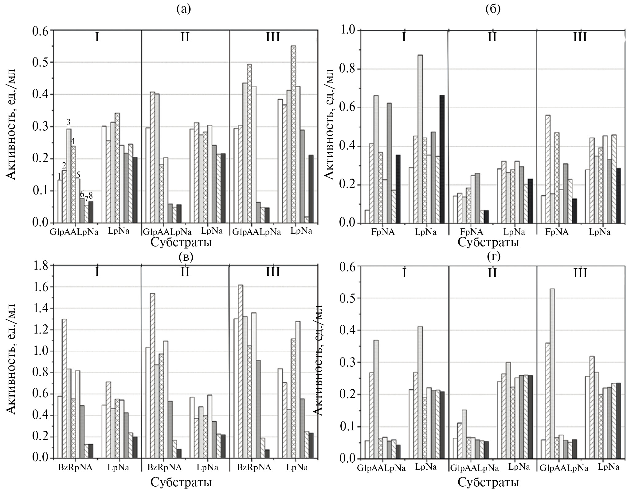 Рис. 2. Субстратная специфичность выделенных штаммов Н–Н1 (а), Н–Н2 (б), Н–Н3 (в), Н–Н4 (г) на синтетических субстратах при оптимальных условиях (1) и различных значениях рН 9 (2) и 10 (3), минерализации 10 (4) и 24 (5) г/дм³, источниках белка – пептон (6), яичный альбумин (7) и температуре культивирования 5°С (8) в зависимости от времени культивирования (3, 5 и 7 сут).