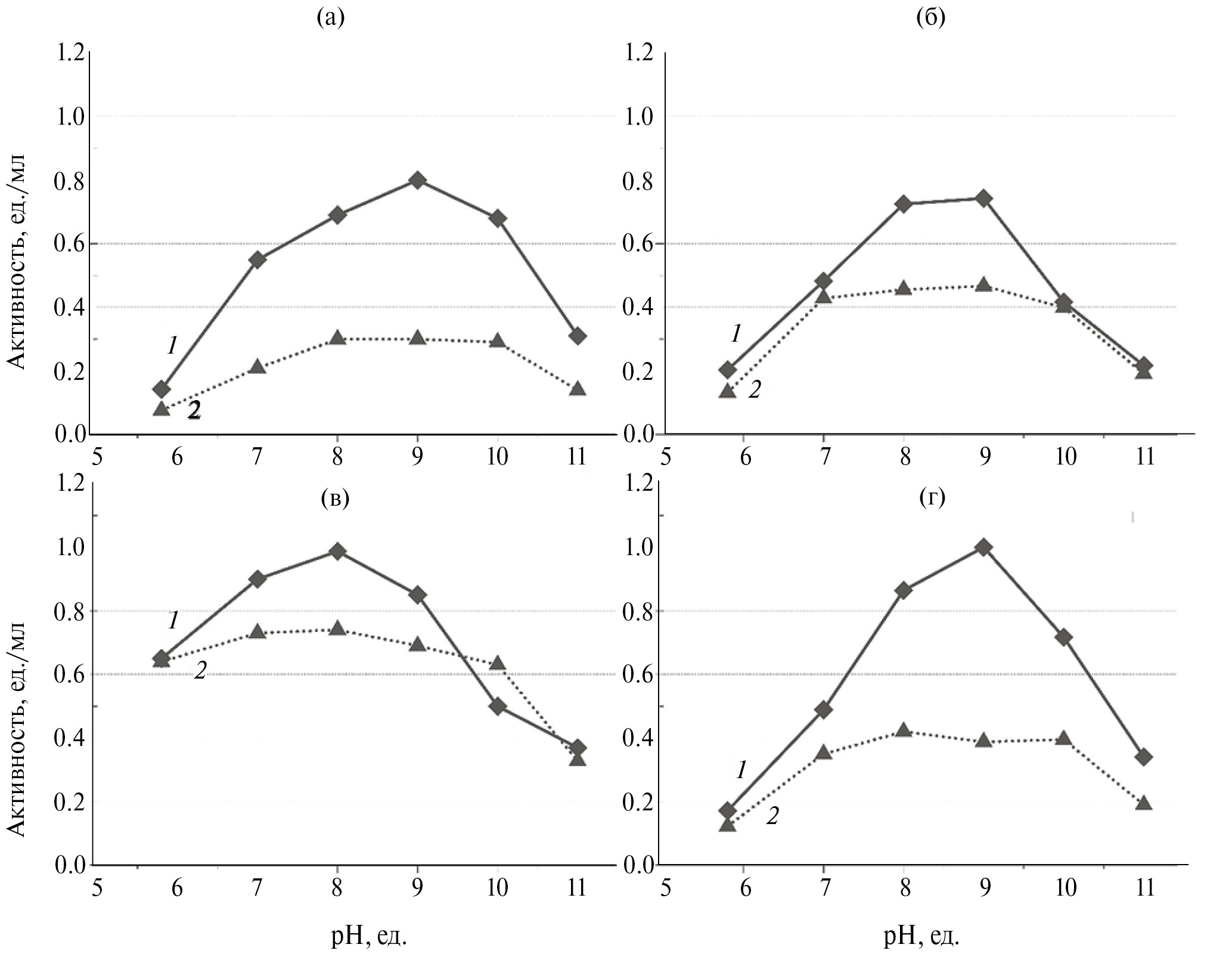 Рис. 4. Оптимум рН (1) и рН-стабильность (2) внеклеточных пептидаз выделенных бактерий: а – Н–Н1; б – Н–Н2; в – Н–Н3; г – Н–Н4.
