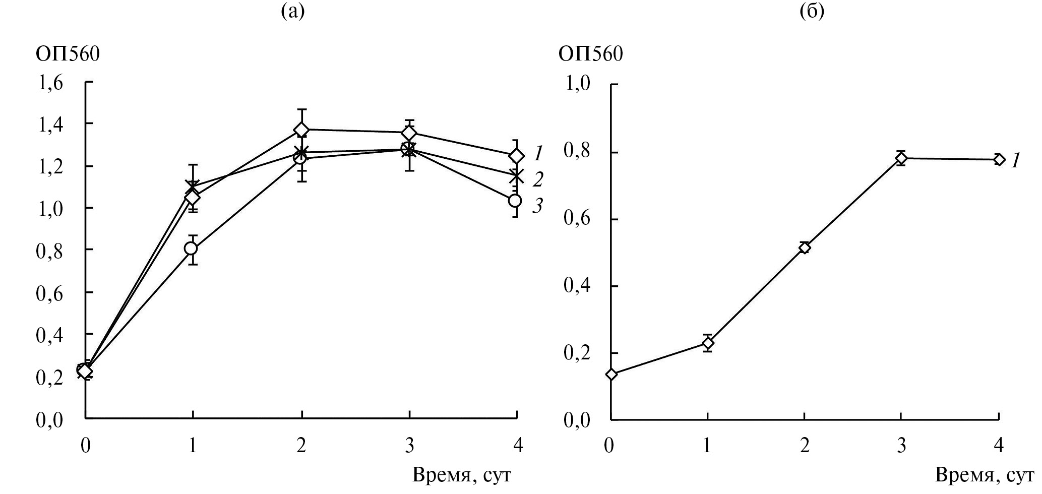 Рис. 2. Динамика роста ризосферных штаммов-антагонистов в жидкой минеральной среде: а ‒ с глифосатом в качестве единственного источника фосфора; б ‒ с Аксиалом в качестве единственного источника углерода и энергии. 1 – штамм G27, 2 – G23-4, 3 – G16.