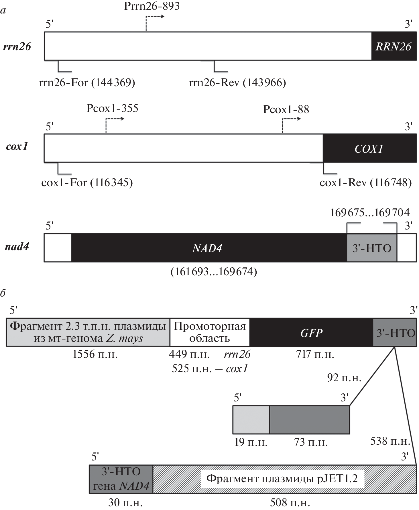 Genetic transformation of higher eukaryotes mitochondria in vivo is one of the unresolved and important problems. For efficient expression of foreign genetic material in mitochondria, it is necessary to select regulatory elements that ensure a high level of transcription and transcript stability. This work is aimed at studying the effectiveness of regulatory elements of mitochondrial genes flanking exogenous DNA using the phenomenon of natural competence of plant mitochondria. For this purpose, genetic constructs carrying the GFP gene under the control of the promoter regions of the RRN26 or COX1 genes and one of the two 3'-untranslated regions (3'-UTR) of mitochondrial genes were imported into isolated Arabidopsis mitochondria, followed by transcription in organello. It was shown that the level of GFP expression under the control of promoters of the RRN26 or COX1 genes in organello correlates with the level of transcription of these genes observed in vivo. At the same time, the presence of the tRNAТrp sequence in the 3'-UTR leads to a higher level of the GFP transcript than the presence in this region of the 3'-UTR of the NAD4 gene containing the binding site of the MTSF1 protein. The results obtained open up prospects for creating a system for efficient transformation of the mitochondrial genome.