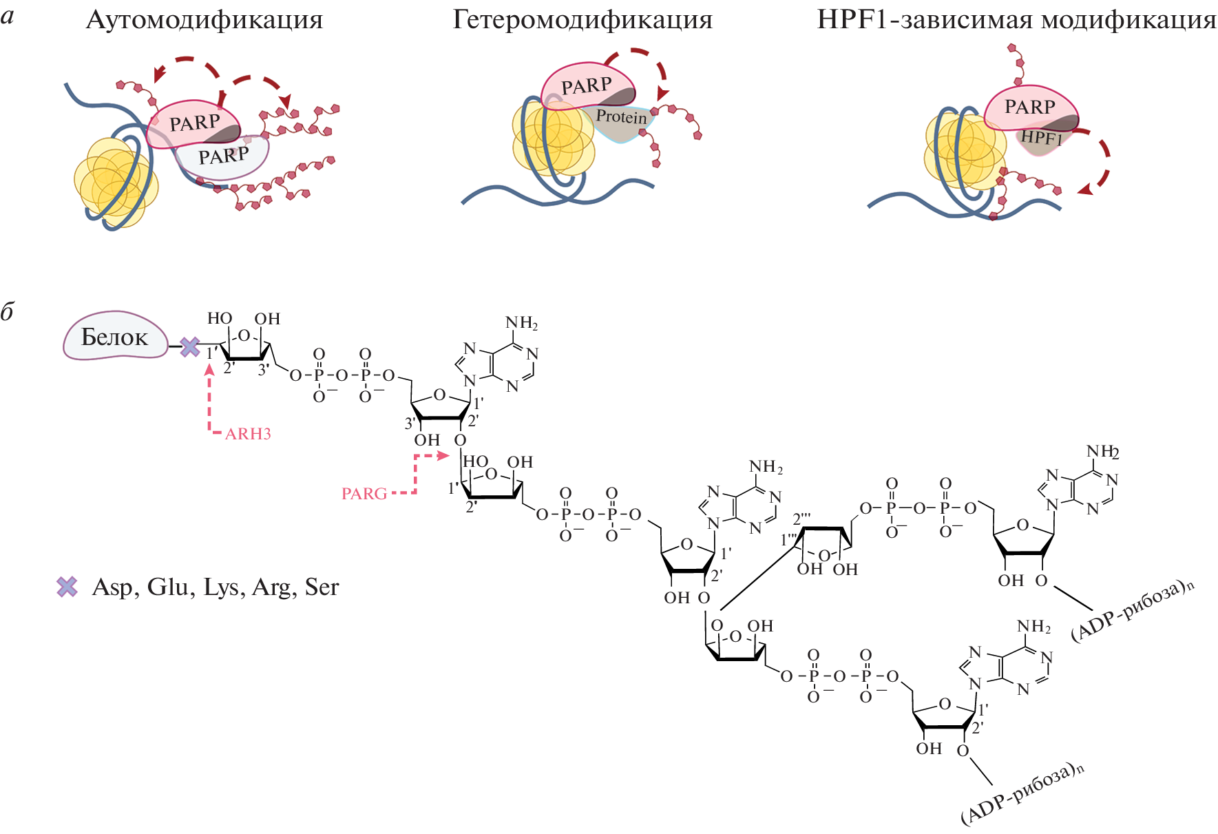 - Alemasova E.E., Lavrik O.I. (2019) Poly(ADP-ribosyl)ation by PARP1: reaction mechanism and regulatory proteins. Nucleic Acids Res. 47, 3811–3827.