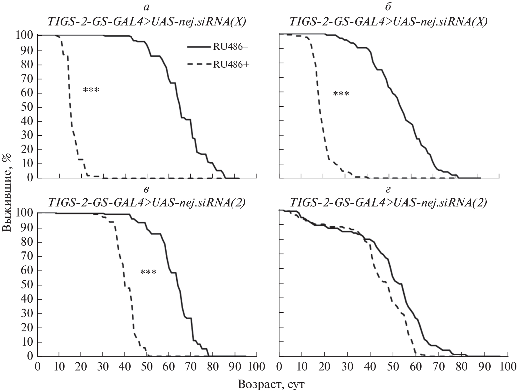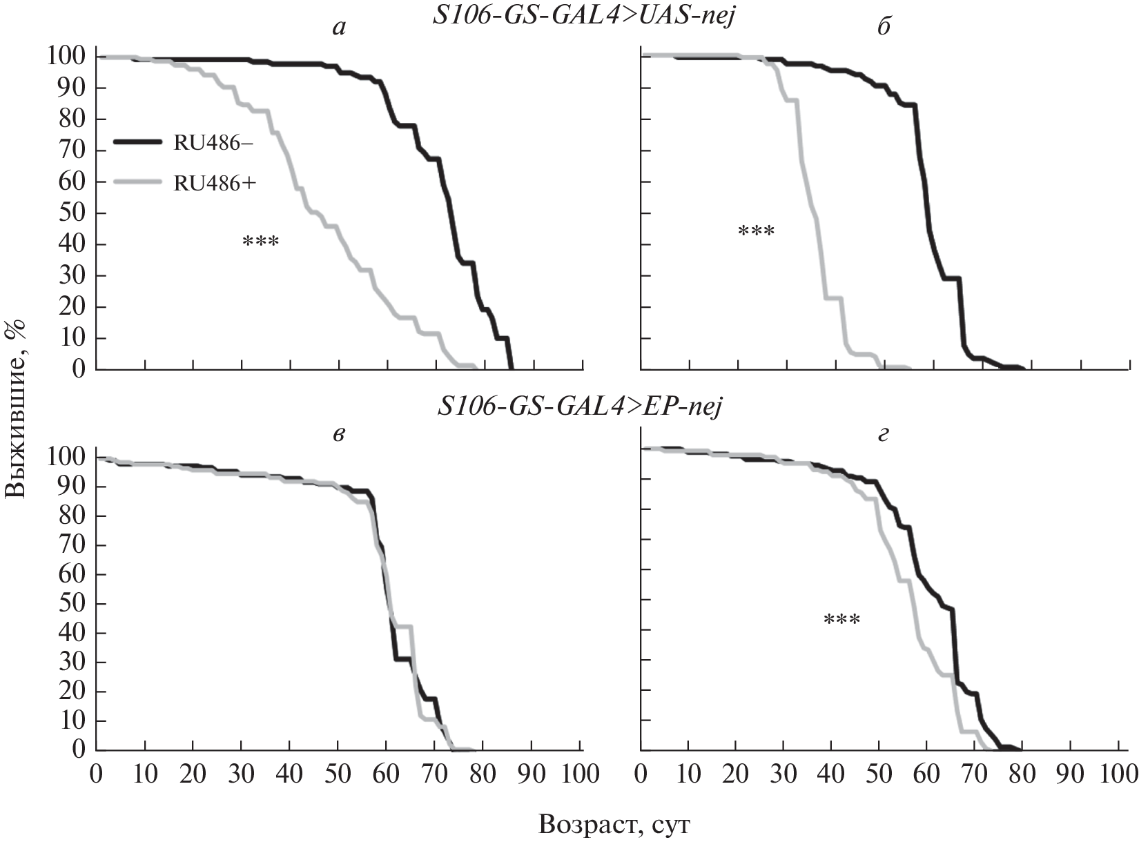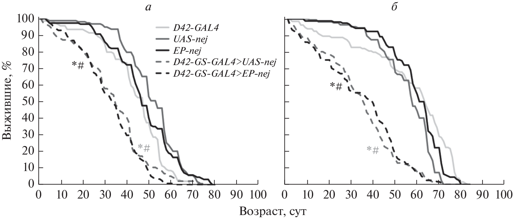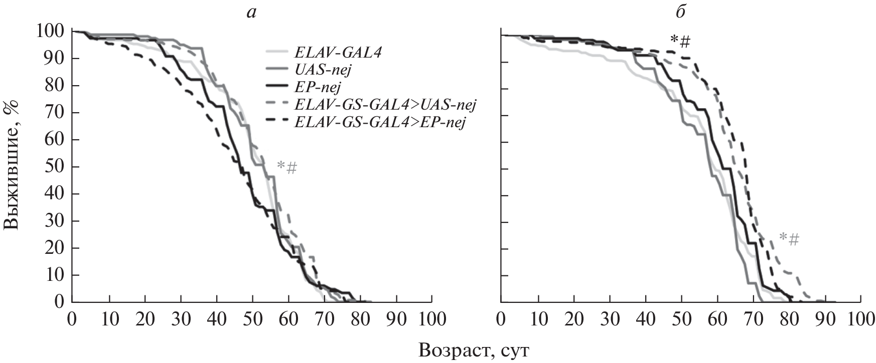 Histone acetyltransferases of the CBP/p300 family play the role of transcriptional regulators and are required for a number of biological processes (cell proliferation and differentiation, organism development, regulation of stress response and metabolism). In a study on the fruit fly Drosophila melanogaster, we analyzed for the first time the effect of overexpression and knockdown of the nejire (nej) ortholog gene in various tissues (fat body, intestine, nervous system) on lifespan. The activation of nej had both a positive and a negative effect on this parameter, depending on the driver and the tissue where nej was induced, as well as the sex of the animals. The effect of increasing lifespan (by 6–15%) was found in females with conditional overexpression of nej in the intestine and constitutive overexpression of nej in the nervous system. But in other cases, a shortening of life (up to 44%), or the absence of statistically significant changes were observed. In addition, activation of nej revealed changes in the expression of stress response genes (Sod1, Gadd45, Hsp27, Hsp68, Hif1). At the same time, knockdown of nej in most variants of the experiment caused a pronounced negative effect on the Drosophila lifespan.
