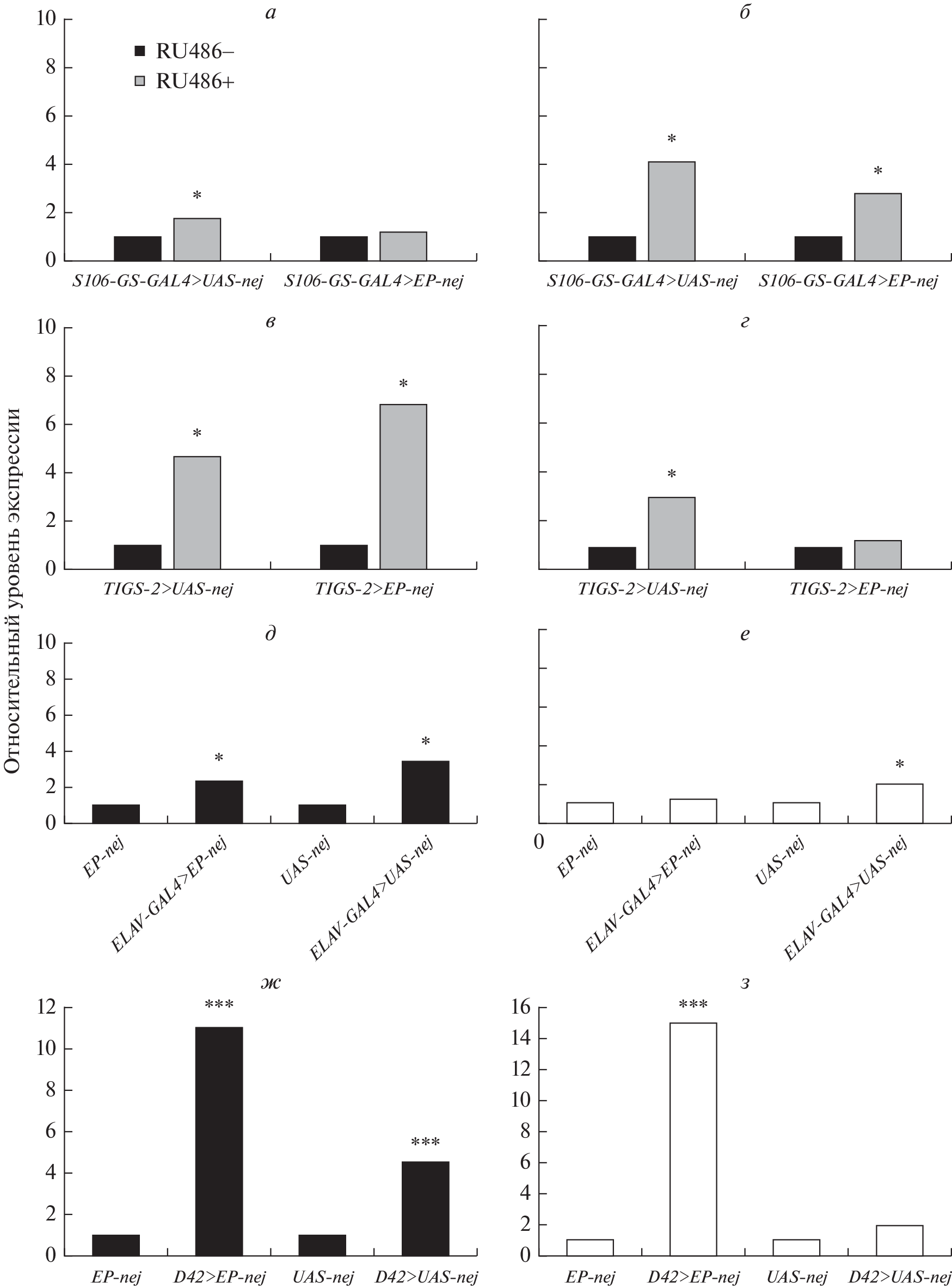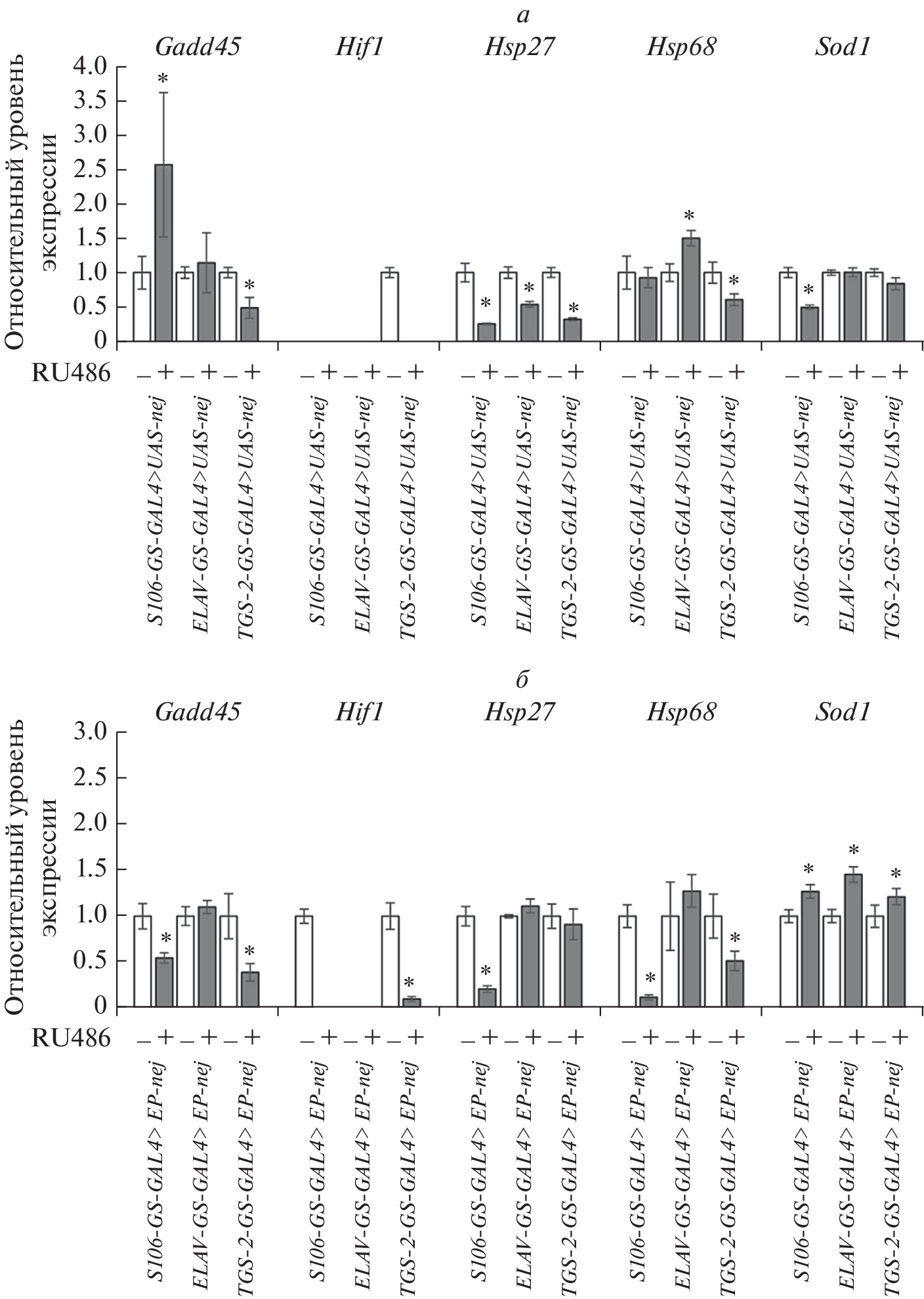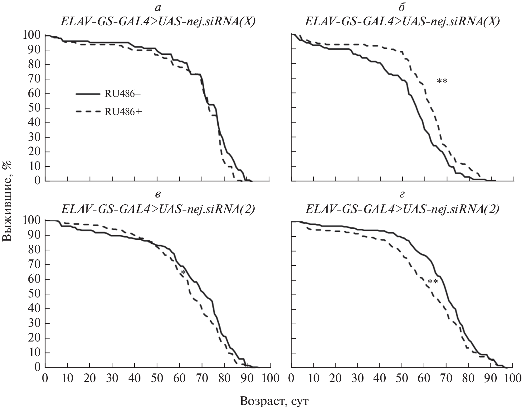 Histone acetyltransferases of the CBP/p300 family play the role of transcriptional regulators and are required for a number of biological processes (cell proliferation and differentiation, organism development, regulation of stress response and metabolism). In a study on the fruit fly Drosophila melanogaster, we analyzed for the first time the effect of overexpression and knockdown of the nejire (nej) ortholog gene in various tissues (fat body, intestine, nervous system) on lifespan. The activation of nej had both a positive and a negative effect on this parameter, depending on the driver and the tissue where nej was induced, as well as the sex of the animals. The effect of increasing lifespan (by 6–15%) was found in females with conditional overexpression of nej in the intestine and constitutive overexpression of nej in the nervous system. But in other cases, a shortening of life (up to 44%), or the absence of statistically significant changes were observed. In addition, activation of nej revealed changes in the expression of stress response genes (Sod1, Gadd45, Hsp27, Hsp68, Hif1). At the same time, knockdown of nej in most variants of the experiment caused a pronounced negative effect on the Drosophila lifespan.