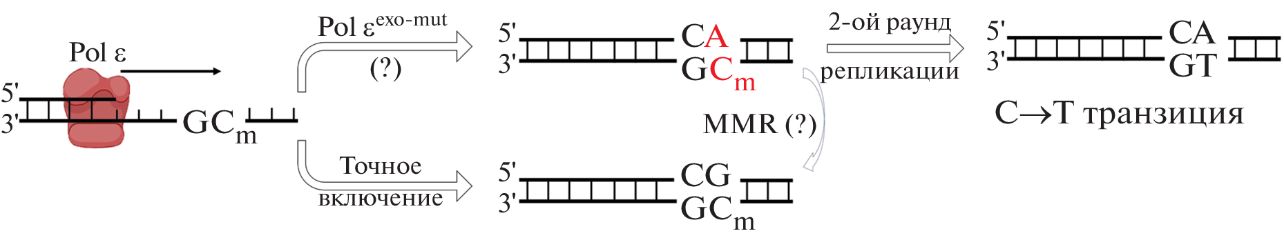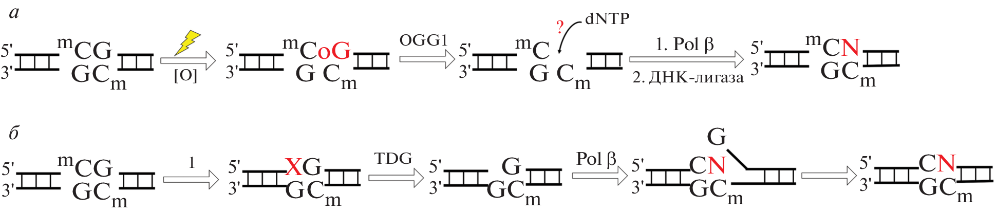 5-Methyl-2'-deoxycytidine (mC) at CpG sites plays a key role in the epigenetic gene function regulation, cell differentiation and carcinogenesis. Despite the importance of mC for normal cell function, CpG dinucleotides are known as mutagenesis hotspots. mC is deaminated with the formation of T, causing C→T transitions. However, several recent studies demonstrated the effect of epigenetic modifications of C on the fidelity and efficiency of DNA polymerases and excision repair enzymes. This review summarizes the known data indicating the existence of mutagenesis mechanisms independent of deamination at CpG sites.