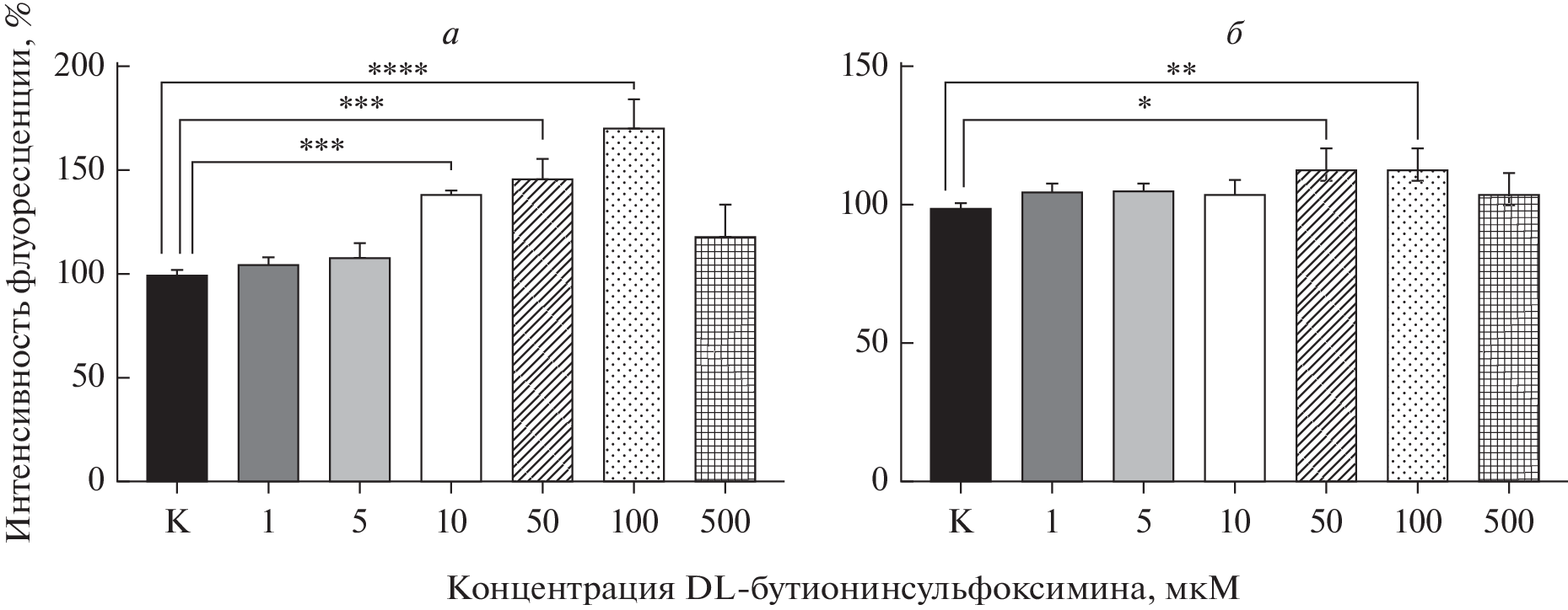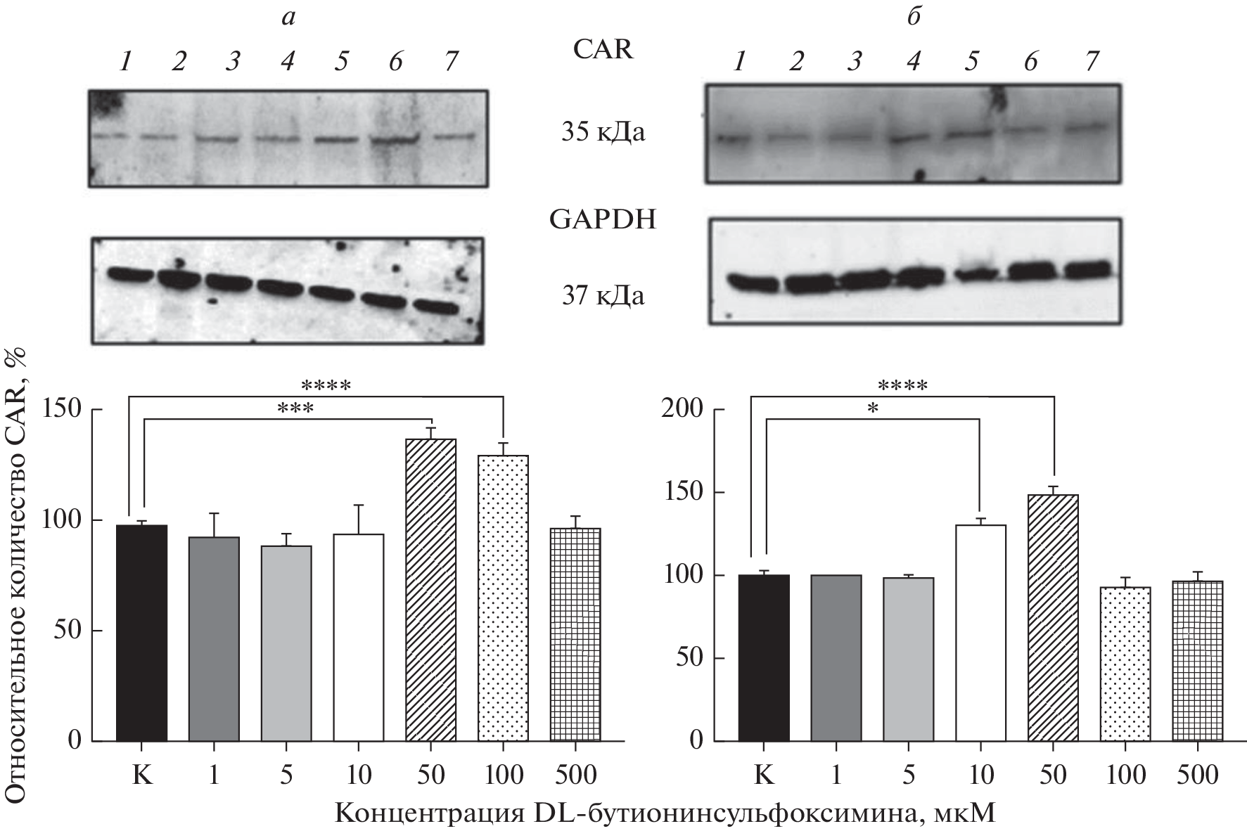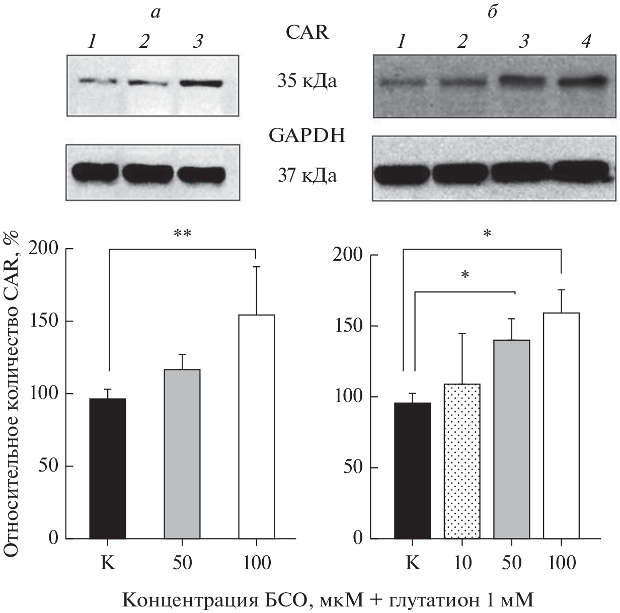 The constitutive androstane receptor (CAR) and the pregnan X receptor (PXR) are nuclear receptors that are involved in the regulation of gene transcription of enzymes responsible for biotransformation and excretion of endo- and xenobiotics. The aim of the study was to study the effect of DL-butyonine sulfoximine (BSO, gamma-glutamylcysteine synthetase inhibitor) on the relative amount of CAR and PXR in Caco-2 cells and to evaluate its mechanisms. BSO was used in concentrations of 1‒500 μM and exposure duration of 24 and 72 h. The generation of reactive oxygen species (ROS) was determined using MitoTracker Red CM-H2 XRos fluorescent probes. Cytotoxicity was analyzed according to the results of the MTT test. The relative amount of CAR and PXR was estimated by the Western blot method. It was shown that BSO caused an increase in the formation of ROS at exposure duration of 24 h at concentrations of 10, 50 and 100 μM, at 72 h – at concentrations of 50, 100 μM. At the same time, at a concentration of 500 μM, BSO reduced the viability of cells during all periods of exposure. The relative amount of CAR increased at BSO concentrations of 50, 100 μM and exposure duration of 24 hours and 10, 50 μM at exposure of 72 h, and PXR – at concentrations of 100 and 500 μM and incubation of 24 h and 50, 100, 500 μM and incubation of 72 h. When used together with BSO, glutathione, the synthesis of which it blocks, it was found that at exposure time of 24 h and BSO concentrations of 50 μM and 72 h and concentrations of 10 and 50 μM, CAR induction was suppressed, and at 50 and 100 μM and exposure time of 72 h – PXR. The introduction of glutathione into the nutrient medium with BSO had no effect on PXR at xenobiotic concentrations of 100 and 500 μM (24 h) and 500 μM (72 h), on CAR – at concentrations of 100 μM (24 h) and 50 and 100 μM (72 h). Thus, BSO can induce CAR and PXR both by increasing the production of free radicals and the development of oxidative stress, and independently as a xenobiotic.