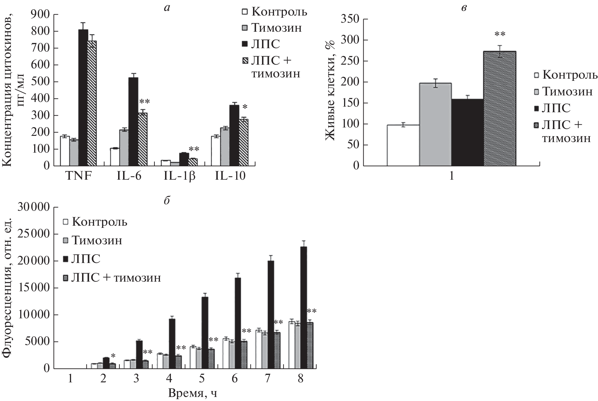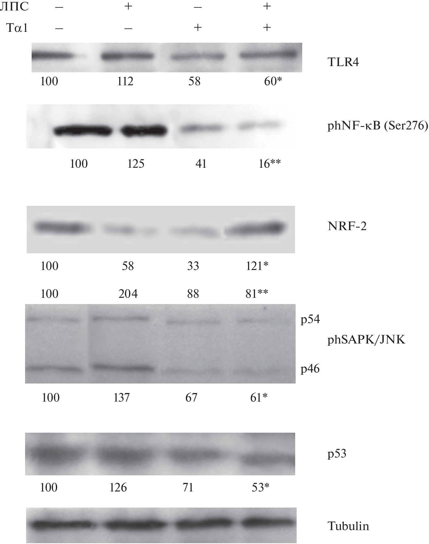 The aim of this work was to study effects of thymosin-1 alpha (Tα1) on the anti-inflammatory response of RAW 264.7 macrophages cultured in the presence of lipopolysaccharide (LPS) from the walls of gram-negative bacteria. Also we evaluated production of pro-inflammatory cytokines and activity of the NF-κB and SAPK/JNK signaling pathways. In addition, the level of expression of a number of genes that regulate cell apoptosis, as well as the activity of receptors involved in the pro-inflammatory response, was determined. Firstly, the addition of Tα1 normalized the level of cytokine production to varying degrees, with a particularly noticeable effect on IL-1β and IL-6. Secondly, the addition of Tα1 normalized activity of the NF-κB and SAPK/JNK signaling cascades and the expression of the Tlr4 gene. Thirdly, Tα1 significantly reduced p53 and the activity of the P53 gene, which is a marker of cell apoptosis. Fourthly, it was shown that an increase in Ar-1 gene expression under the influence of LPS was significantly reduced using Tα1. Thus, it was found that the presence of Tα1 in the RAW 264.7 cell culture medium significantly reduced the level of the pro-inflammatory response of cells.