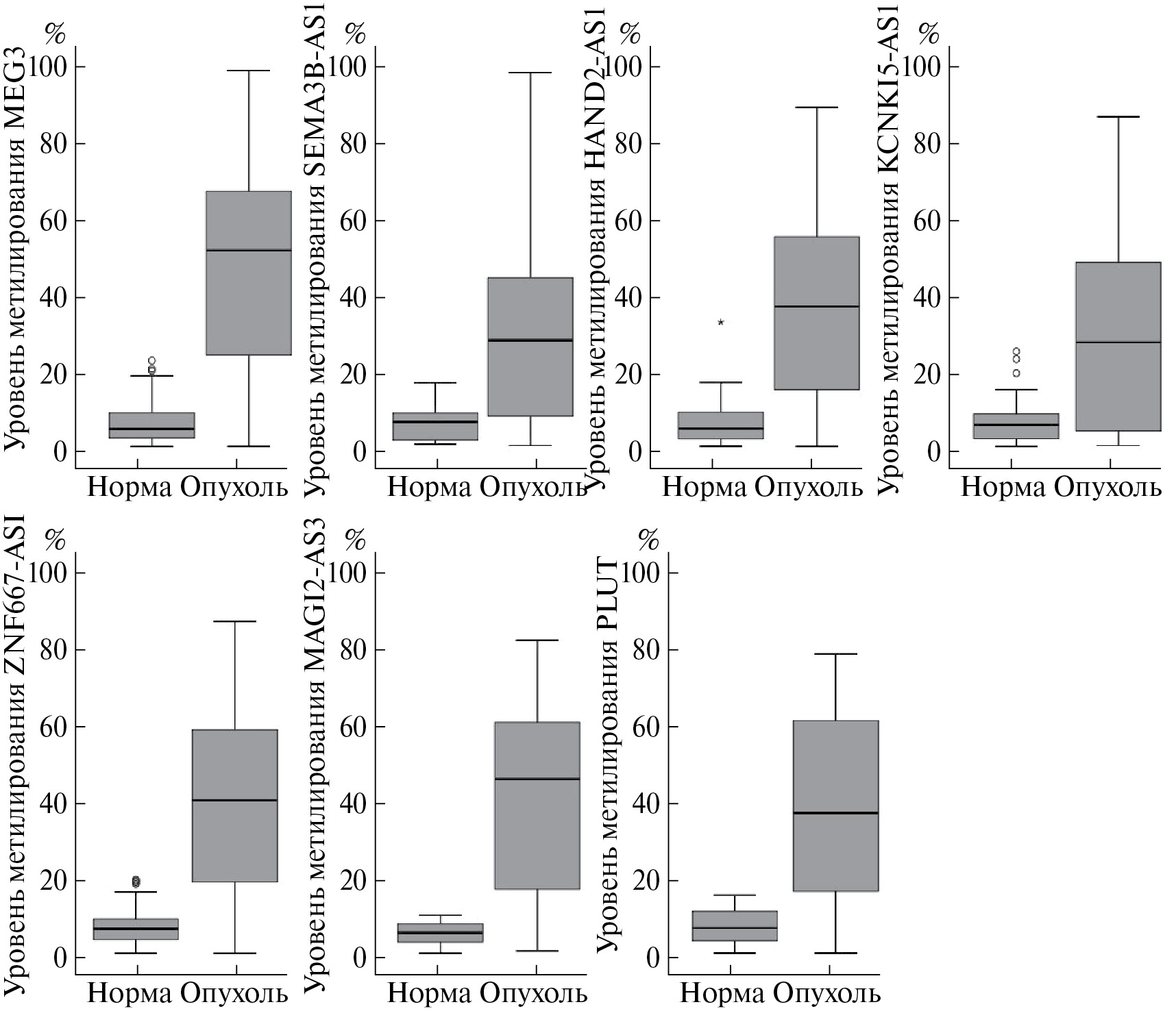 Рис. 1. Уровень метилирования генов днРНК MEG3, SEMA3B-AS1, HAND2-AS1, KCNK15-AS1, ZNF667-AS1, MAGI2-AS3 и PLUT в образцах опухолей молочной железы и парных к ним нормальных тканях. Верхняя и нижняя границы прямоугольников на диаграммах соответствуют Q1 и Q3 (внутрь прямоугольника попадает 50% значений). Линия внутри прямоугольника соответствует медиане. Линиями сверху и снизу от прямоугольников отмечена “ограда”, расположенная на расстоянии 1.5 межквартильных расстояний (Q1–Q3) от нижней и верхней границы “коробки”.