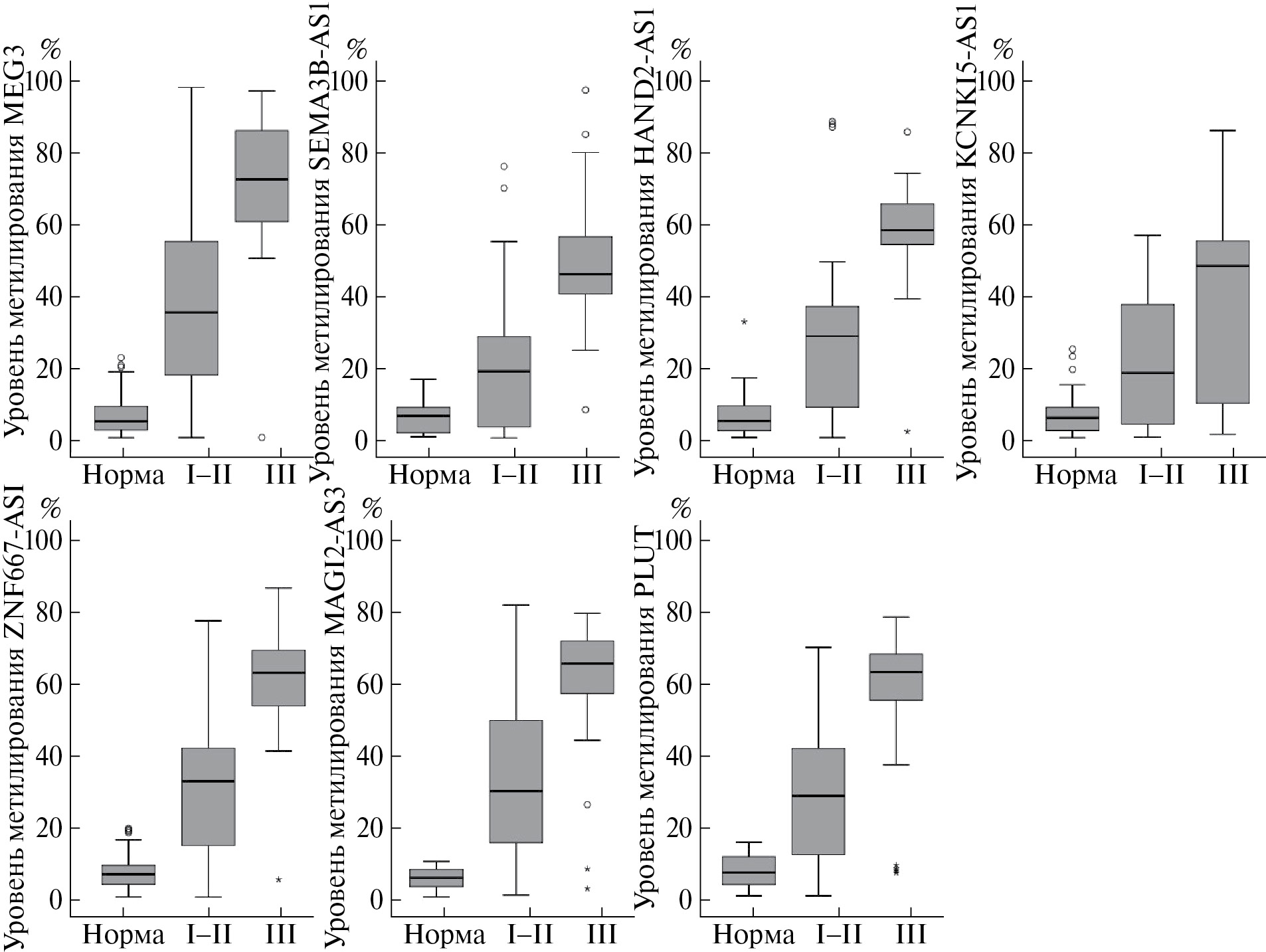 Данные по метилированию генов днРНК при РМЖ были сопоставлены с клинико-патоморфологическими характеристиками образцов больных РМЖ. Выявлено статистически значимое (p < 0.001) увеличение уровня метилирования семи генов днРНК (MEG3, SEMA3B-AS1, HAND2-AS1, KCNK15-AS1, ZNF667-AS1, MAGI2-AS3 и PLUT) (рис. 2) на более поздней стадии РМЖ (III) по сравнению с ранними стадиями (I–II), а также при увеличении размера опухоли (р < 0.01).