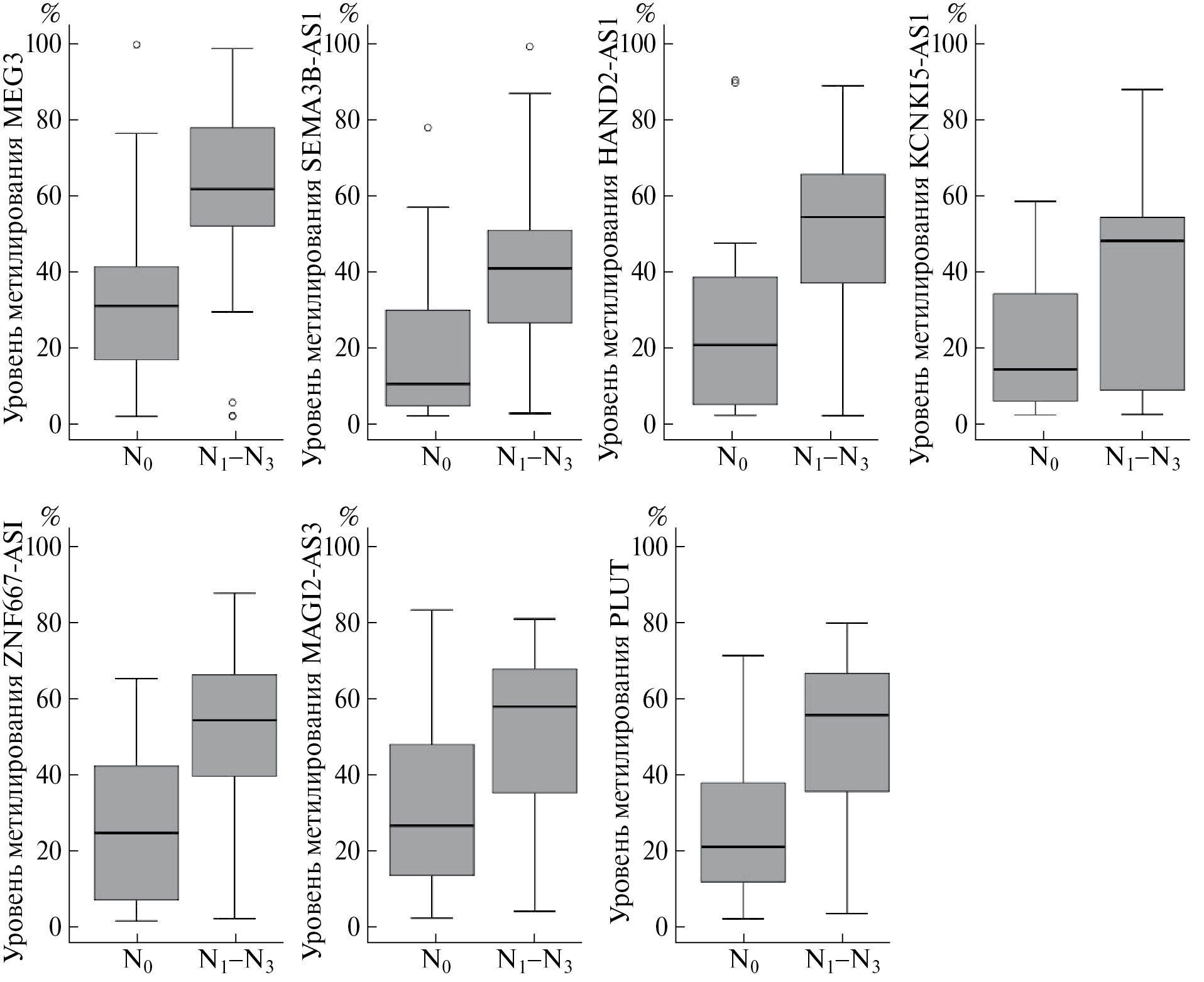 При сравнении уровня метилирования в образцах РМЖ без метастазов (N0) и в образцах с метастазами в лимфатических узлах (N1–N3) нами также выявлено статистически значимое увеличение уровня метилирования всех семи генов днРНК: MEG3, SEMA3B-AS1, HAND2-AS1, KCNK15-AS1, ZNF667-AS1, MAGI2-AS3 и PLUT (рис. 3).