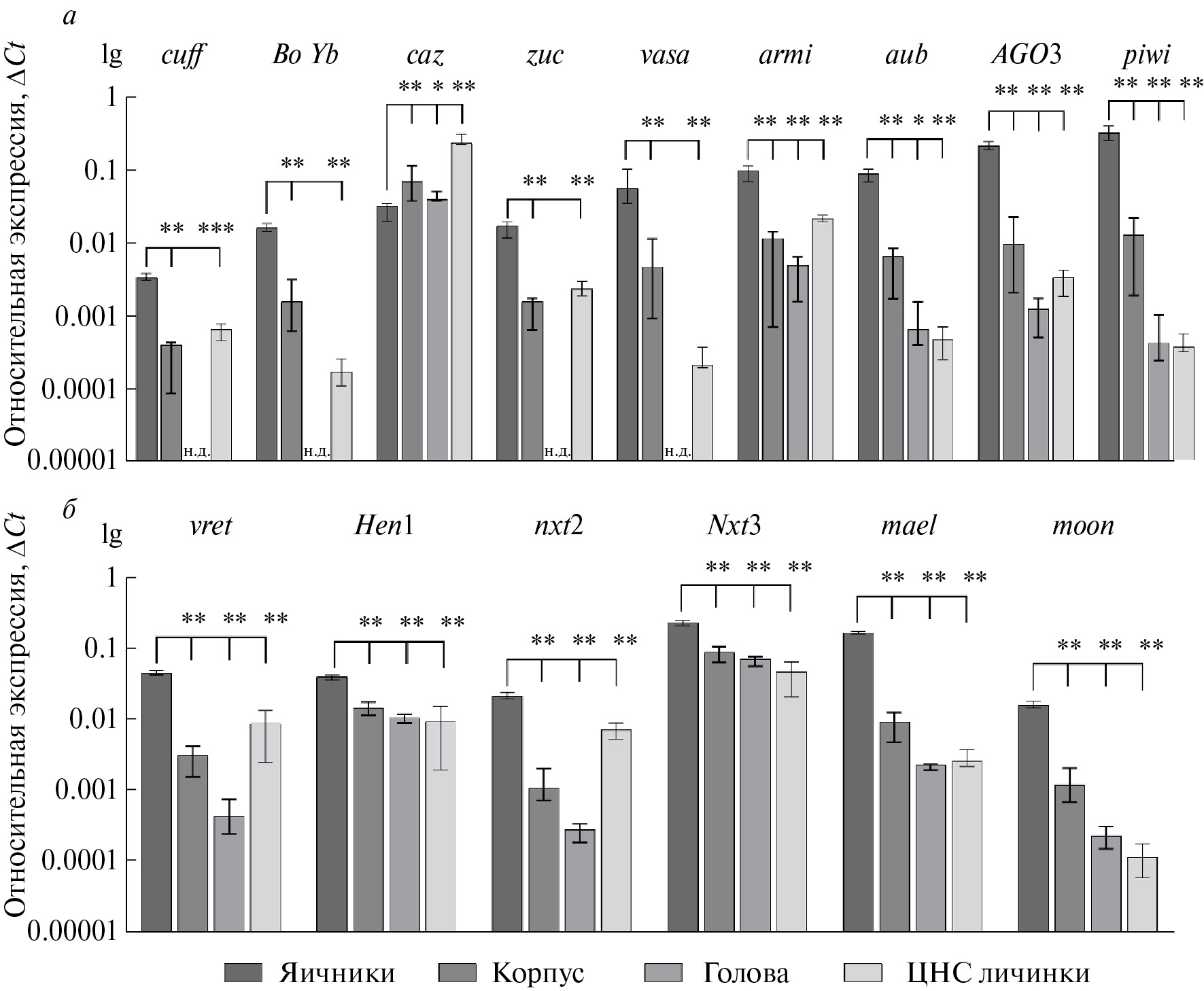 Транскрипция генов cut, BoYb, zuc и vasa обнаружена во всех тканях имаго, кроме тканей головы. При этом все исследуемые гены экспрессируются в ЦНС личинок. Экспрессия четырех ключевых генов системы piРНК-интерференции (aub, AGO3, armi и piwi) обнаружена и в головах самок, и в ЦНС личинок. Эти гены необходимы для осуществления цикла “пинг-понг” и запуска репрессии ретротранспозонов. Полученные результаты указывают на то, что в соматических тканях система piРНК-интерференции может быть активна и задействована в регуляции экспрессии отдельных ретротранспозонов.