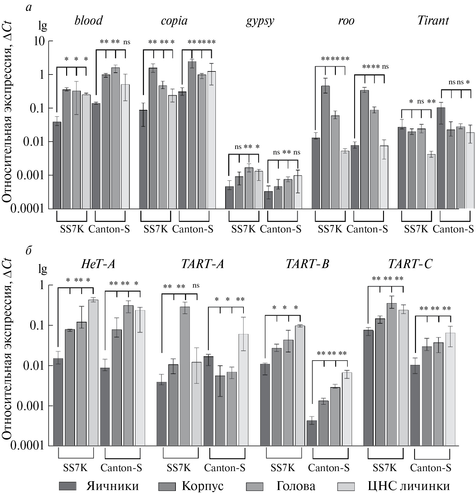 Рис. 2. Логарифм относительной экспрессии ДКП-ретротранспозонов blood, copia, gypsy, roo и Tirant и теломерных LINE-элементов TART-A, TART-B, TART-C и Het-A в тканях яичников, корпусов, головы самок и ЦНС личинок SS7K и Canton-S. *p < 0.05, **p < 0.01, ns – статистически незначимое изменение.
