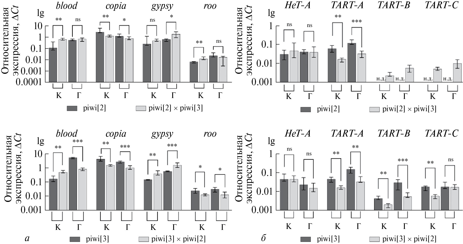 Рис. 3. Логарифм уровня относительной экспрессии ДКП-ретротранспозонов blood, copia, gypsy, roo и Tirant (а) и теломерных ретротранспозонов TART-A, TART-B, TART-C и HeT-A (б) в тканях корпуса и головы самок линий piwi[2] и piwi[3], а также самок F1. К ‒ корпусы, Г ‒ головы, н.д. – не детектируется, *p < 0.5, **p < 0.01, ***p < 0.001, ns – статистически незначимое изменение.