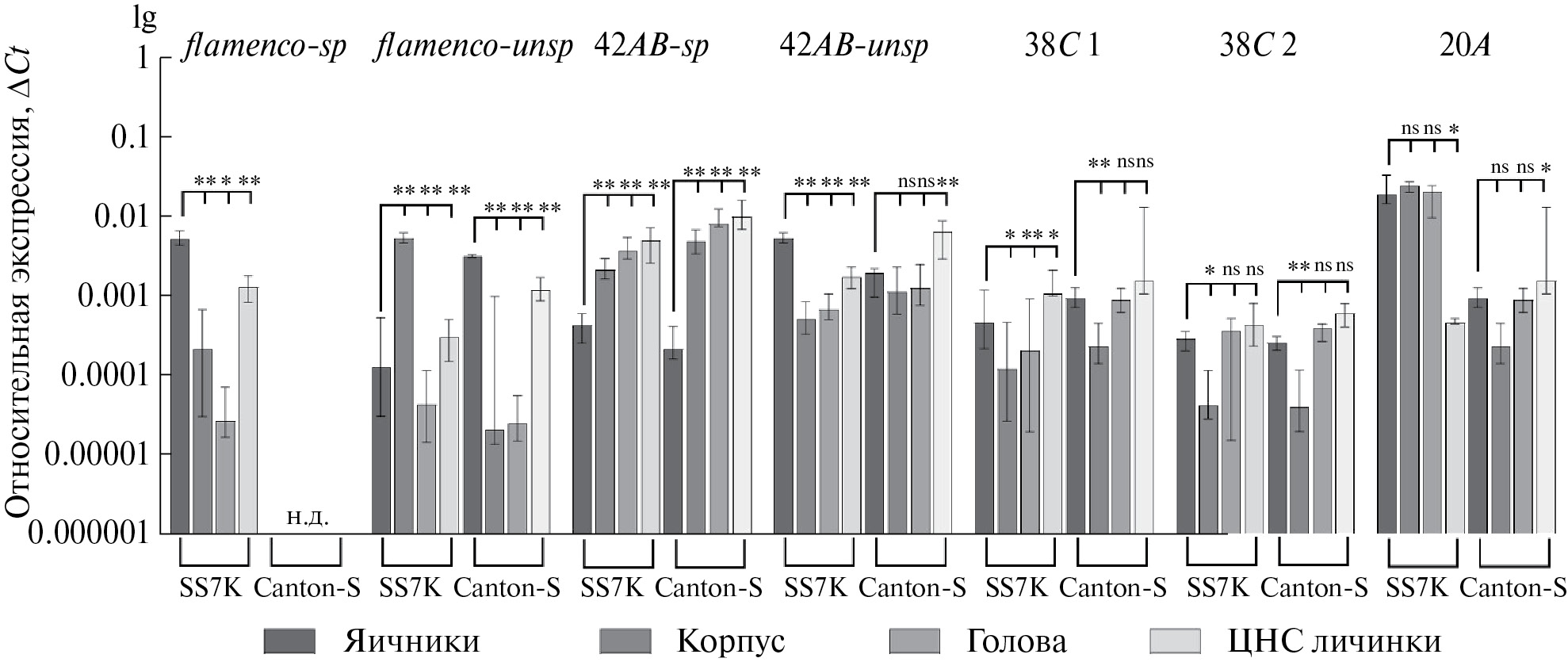 Рис. 5. Относительный уровень экспрессии (lg) различных кластеров piРНК в тканях яичников, головы и корпуса самок SS7K и Canton-S. *p < 0.05, **p < 0.01; ns – статистически незначимое изменение, н.д. – не детектируется.
